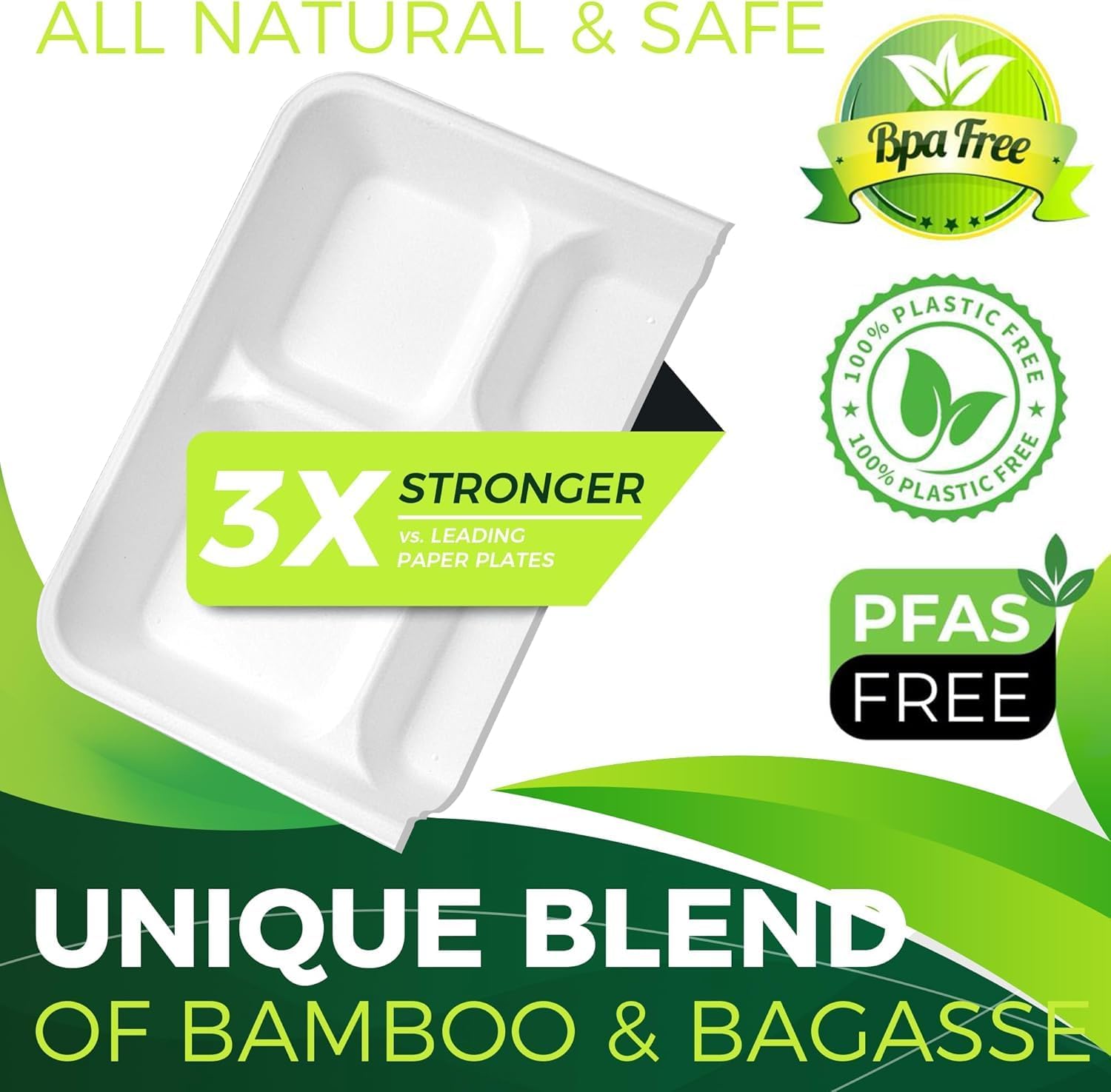 🌿【A Great Alternative to Plastic and Paper】- Our 5-compartment plates are made from bagasse, a by-product of sugarcane processing. They are compostable and designed to make life easier while reducing our carbon footprint. 🌿 【Thicker, Sturdier & Leak-Resistant】- Our unique process mixed bamboo and bagasse to create heavy-duty compostable trays you will love! Bamboo has natural strength and liquid resistant characteristics that help provide superior strength and reduce unnecessary leaks. They can even handle the messiest food items thanks to the oil proof design. The wide rim design allows you to serve saucy foods on the trays without worrying about spills and messes. 🌿 【Microwave & Freezer Safe】- These trays can be used for hot or cold food and in microwave or freezer. Microwave safe up to 248°F. Oil-resistant and leakproof. Hold lots of food without breaking or soap through. 🌿 【Plant-Based Material & Safe】- All trays are made from natural materials. They are grown and harvested ethically and can be replaced within. All trays comply with USA and European ASTM D6400 & EN13432 High Standards for compostability. NO BPA, NO PFAS, NO Wax Lining & NO Chlorine Chemicals that may be found in plastic or paper trays. NO TREE is cut down to create these sturdy and disposable trays. 🌿 【Occasions】- Perfect for restaurants, family gathering, food trucks, special events, catering, wedding, parties and etc. Free from doing dishes!