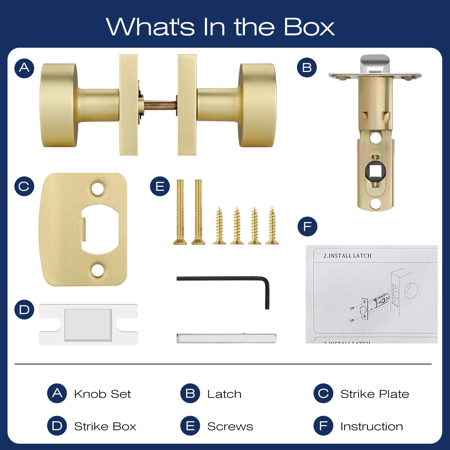 | Included Components | Gold Door Knob, Adjustable Latch, Installation Hardware, Instruction Manual |