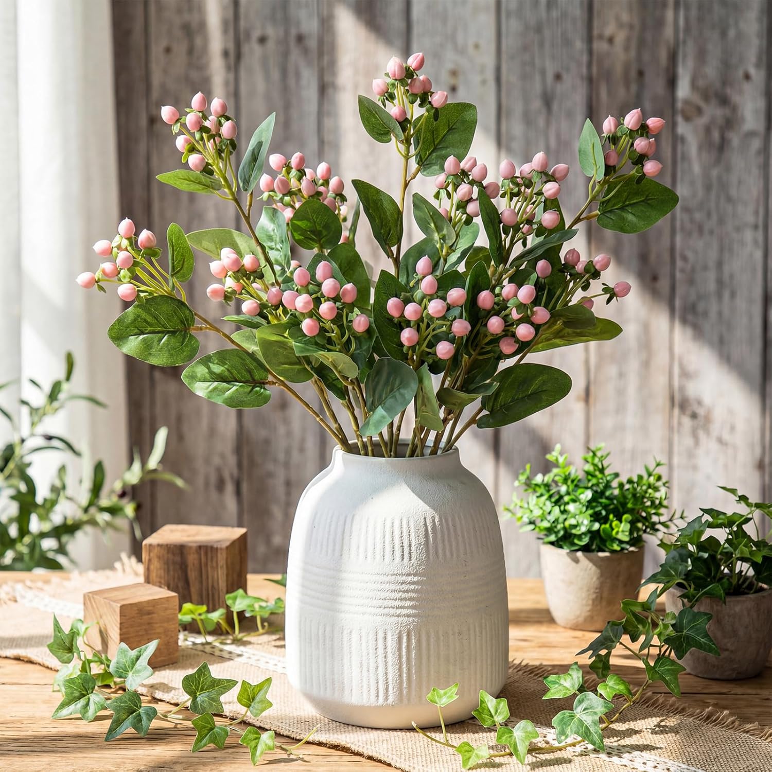 Features: Versatile Uses: Our lifelike artificial Hypericum berry stems are versatile for both indoor and outdoor home decor. Ideal for weddings, holiday celebrations, and other special events, whether intricately woven into wreaths, Whether tied into DIY wreaths, vases, or table decorations, or combined with other elements, their exquisite details and vibrant colors always leave a lasting impression Long-lasting Decorations: Our lifelike berries will bring a fresh feel to your home décor. They effortlessly bridge the changing seasons with rustic accents, laying the foundation for a captivating visual feast year after year. Easy to clean and retaining their vibrant colors, they will delight you for years to come Specifications: Material: silk, wire, plastic Color: pink Size: 27.6 inch Package includes: 4 x Artificial Hypericum Berry Stem Notes: Manual measurement, please allow slight errors on size. The color may exist a slight difference due to different screen displays