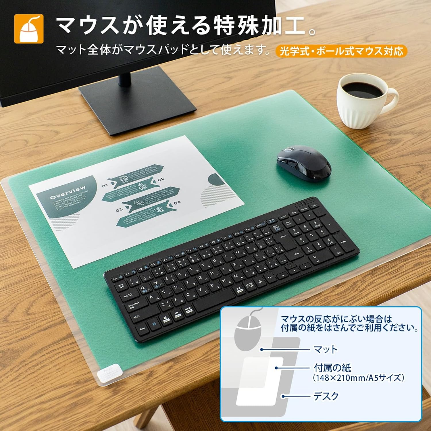 Desk mat protects your desk from scratches and stains. Nap Cut Desk Mat (Recycled Polyvinyl Chloride) OA Type Economy Single Type (No Underlaying) Environmentally friendly 40% recycled resin (PVC) desk mat [Reduces migration on both sides] An economical type that reduces ink transfer even while holding prints and document copies over time. Diagonal Cut: Beveled edges are cut so your hands won't get hurt even after long periods of work. Mouse Compatible: Special processing allows you to use the mouse pad with the whole mat as a mouse pad. (Optical/ball mouse compatible*) [Semi-gloss (grain)] Non-glare (grain) type that has little light reflection and makes it easy to see what you have tried. Depending on the mouse, there may be some reactions