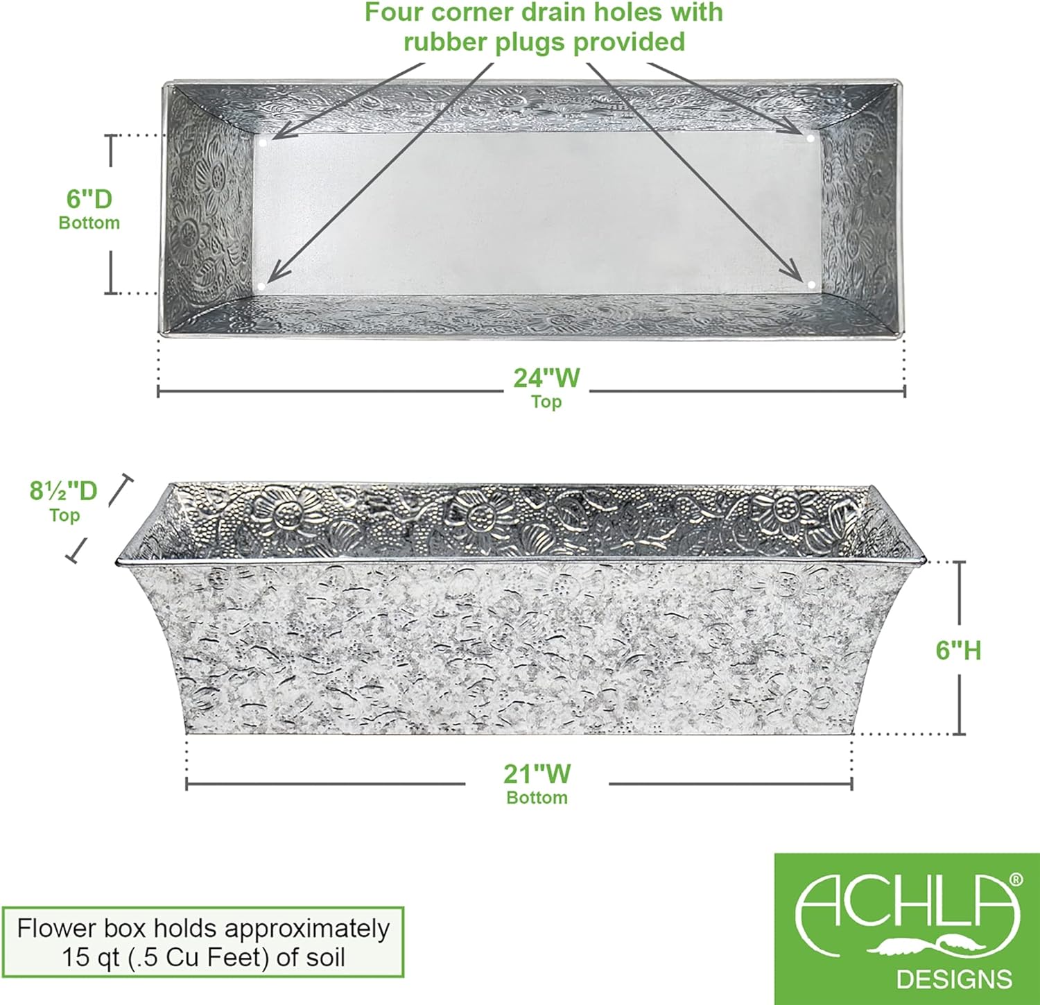 These dressed up Embossed Flower Boxes have a rolled edge, embossed floral pattern decoration and a tapered classic rectangular shape. Made from galvanized steel they have the folksy vintage quality of an antique market find. All flowerboxes have drain holes with rubber plugs that can be removed for direct planting. Use any of our coordinating Achla Designs mounting hardware and brackets for top of Handrails (BGK-13/14) Wall-Mounting (SFB-02) or Clamp-On (SFB-02C) for railings.