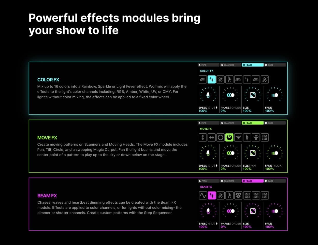 Offering a unique new hands-on interface for creative lighting control, the ADJ WMX1 is a powerful and compact standalone DMX controller. Designed for creating high-impact lightshows on the fly without a computer, it features an intuitive workflow, powerful internal FX engine, and tactile controls that make it easy for anyone to take control of a DMX lighting rig comprised of multiple fixture types. Setup of the WMX1 is quick and straightforward, with a menu interface on the 4.3” capacitive touch TFT screen allowing easy selection, addressing, and grouping of fixtures. 3,500+ fixture profiles are included on the controller itself, with more than 15,000 accessible through the supporting WTOOLS app. The WMX1 also features a Fixture Builder, for creating custom profiles or for use with old or obscure fixtures, as well as a Fixture Calibration tool, which allows limiting of the area covered by moving heads. Once configured, the system allows independent control of up to eight groups of fixtures (four accessible via a Shift key), with 37 backlit silicone buttons and four rotary encoders allowing three different FX engines (Color, Move and Beam) to be easily triggered and customized independently for each group. The controller also features separate dedicated buttons for Strobe, Blinder, Speed, Blackout and Smoke. The WMX1 features four DMX universes and four output sockets (two 5-pin and two 3-pin) with the ability to map any universe to any output, allowing the unit to also serve as a DMX splitter. Out of the box the system supports a single DMX universe (output via all four sockets), while three additional universes are available as upgrades through the WTOOLS app. It also features both an internal microphone and 3.5mm jack line input socket for automated BPM detection, as well as a button that allows the BPM to be ‘tapped in’ manually. A Color Picker interface on the screen, which allows easy selection of just the right hue, can be used both for RGBW and RGBWA+UV LED fixtures. Other useful features include automatic matching of similar GOBOs across different fixture types, Fixture FLIP function (for reversing beam order), Fixture SPLIT function (for splitting up multi-FX bars) and Auto-recovery of the active project (no manual saving needed). Despite its low weight (2.36lb / 1070g) and compact dimensions (7.68” x 8.66” x 2.44” / 195 x 220 x 62mm [LxWxH]), the WMX1 is extremely robust. Inside its tough ABS plastic shell, the unit features a powder-coated steel base plate and reinforced back plate. Its 220Mhz CPU with ARM core and 8MB RAM / 16MB flash memory allow for extremely complex effects to be layered and run independently across multiple groups all in real time.