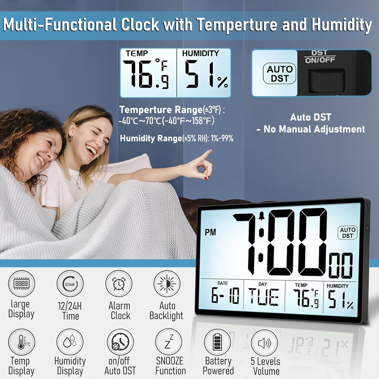| Additional Features | Adjustable Brightness, Adjustable Volume, Alarm, Large LCD Display, Temperature & Humidity Display |