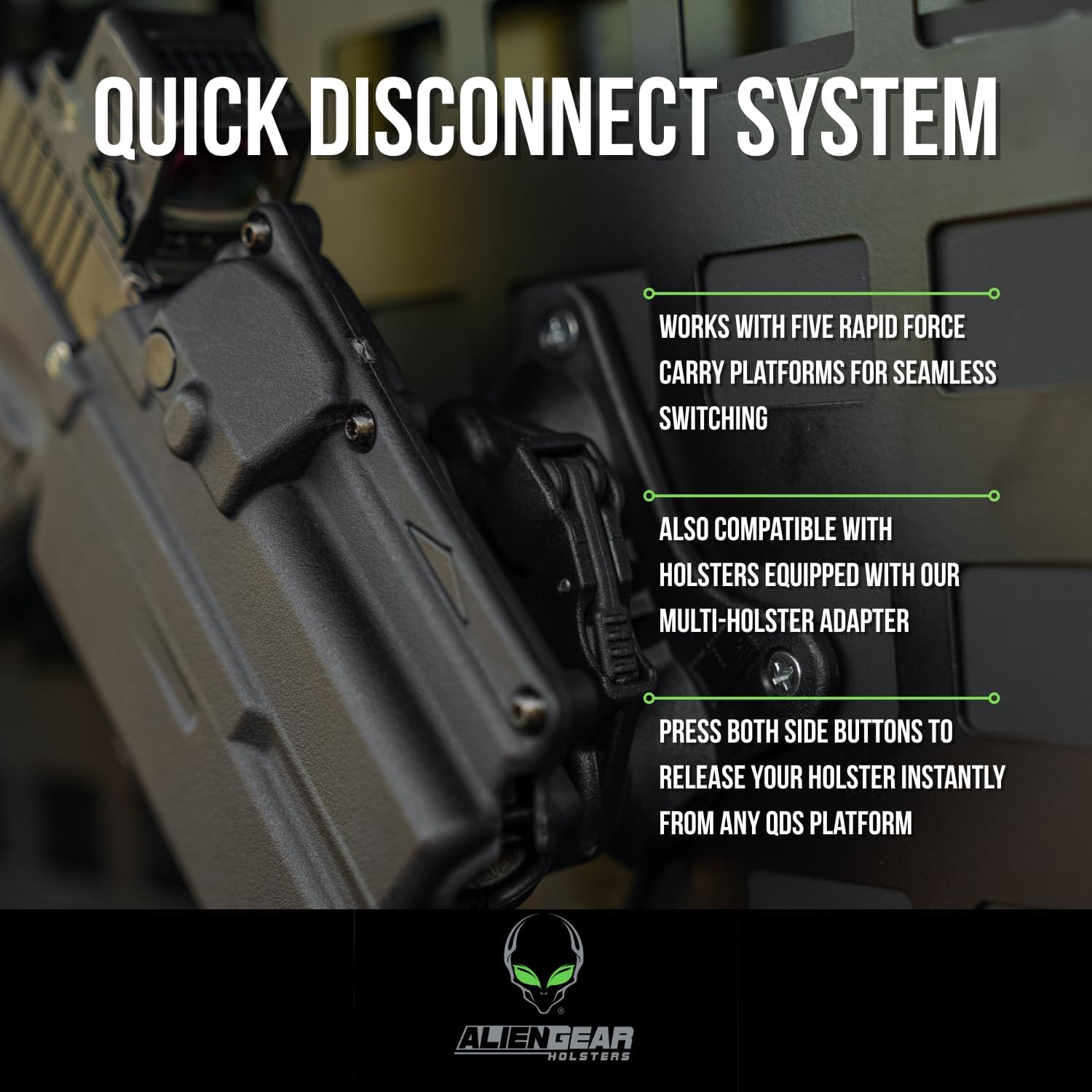 The Alien Gear Rapid Force Quick Disconnect System (QDS) is an innovative mounting solution that lets you attach or remove your holster from multiple carry platforms in seconds—no tools, no hassle. Designed for ultimate versatility, the QDS allows you to move seamlessly between Drop Leg, Belt Slide, Paddle, MOLLE, and Surface Mount setups with a simple click. Installation is simple: Mount the QDS Attachment (male) to your holster’s triangular mount. Mount the QDS Receiver (female) to your chosen carry platform. Slide the holster into place until you hear the click. To remove, press the two side-release buttons and pull the holster free. Built from durable materials and precision-engineered for security, the QDS is fully compatible with all Alien Gear Rapid Force holsters and can also integrate with competing holsters that feature our Multi-Holster Adapter. Whether you’re an officer swapping between duty gear, a competitive shooter changing stage setups, or a prepared citizen optimizing your kit, the QDS delivers unmatched convenience and adaptability. IMPORTANT: This is sold as a complete system and includes both the QDS Attachment and QDS Receiver. Proudly made in the USA.
