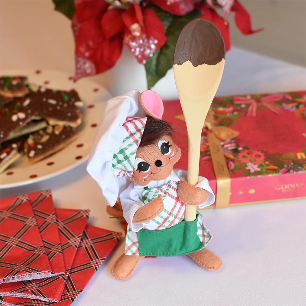 New for Christmas 2024, meet our delightful, chocolate-loving Chef Mouse, part of the enchanting 2024 Christmas Candy Collection. This captivating set brings joy to homes and kitchens with its array of holiday baking characters. Standing at 6 inches, our Chef Mouse is eager to stir up holiday chocolate with his mixing spoon, adding a touch of festive charm to your decor. Clad in a cheerful red, white, and green plaid apron and chef's hat, he's ready to create holiday magic. Pair him with his baking companions for a fun holiday scene. Note: Facial expression may vary.