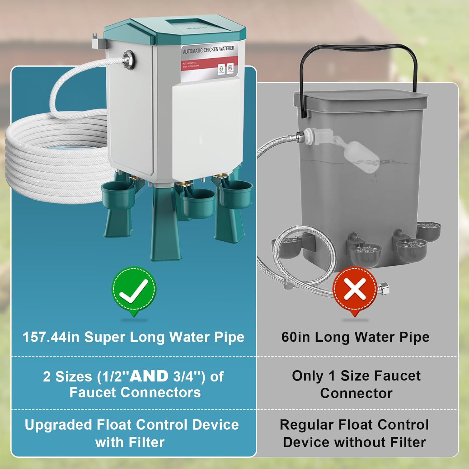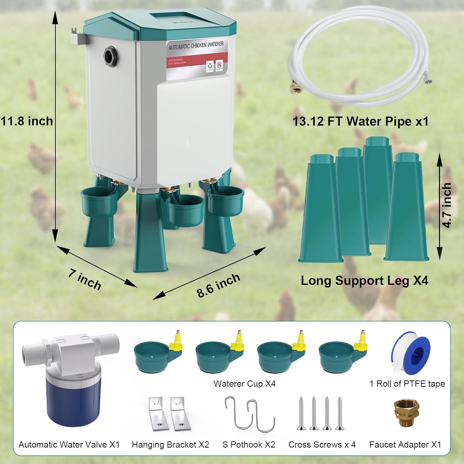 | Included Components | 1 Roll of Waterproof Tape, 2pcs of Mounting Brackets, 4pcs of Nails, 2pcs of S-Hooks, 1pc of 13.12Ft Water Pipe, 1pc of 1/2'' Faucet Connector and 1pc of 3/4'' Adapter, 1pc of Automatic Chicken Waterer, 4pcs of Water Cups, 4pcs of Long Support Legs, 1pc of Float Valve |