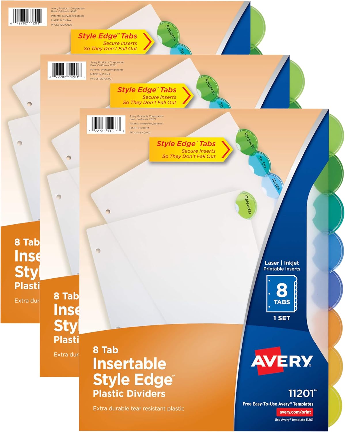 Avery 5-Tab Plastic Binder Dividers with Insertable Style Edge Tabs are a simple yet sophisticated solution to paper organization. Each binder divider with tabs is made of durable, tear-resistant PVC-free plastic, ideal for 3-ring binders with frequently referenced documents. Style Edge divider tabs give your dividers a modern look with a unique oval tab shape and are designed to keep your inserts locked in during use. With these page dividers, you're certain to achieve an organizational edge that's both colorful and attractive. Sturdy and built to withstand everyday use, these multicolor sets of translucent plastic 5-tab binder dividers are great for organizing schoolwork, personal finances, recipes, coupons, sheet music, or anything else that needs sorting. These plastic dividers are 3-hole punched and ready for immediate use. For a clean, professional look, personalize your page tab inserts using free templates, fonts and designs on the Avery site. Inserts are compatible with laser and inkjet printers. This item comes with 24 sets for a total of 120 binder dividers.