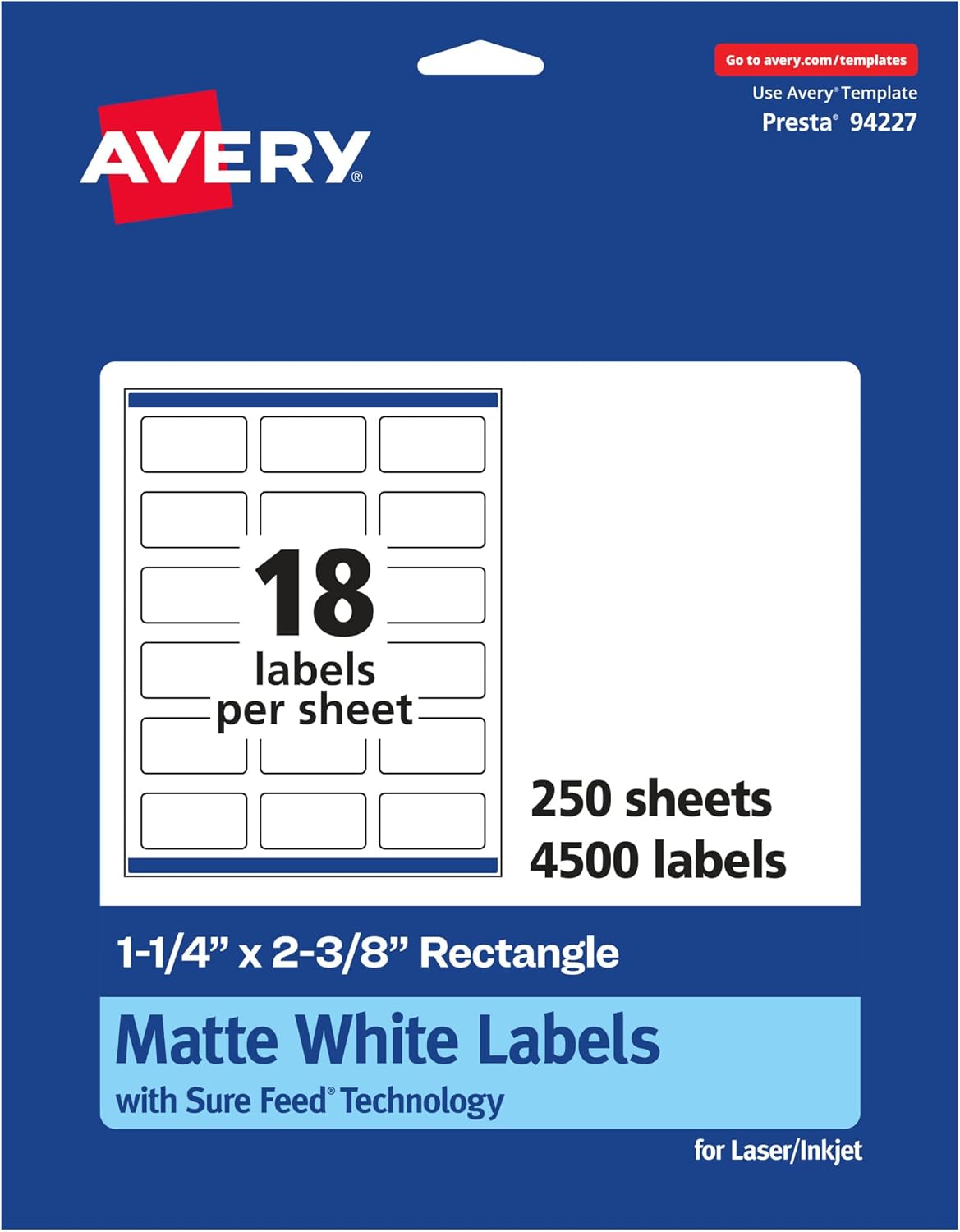 Matte white Avery labels are the perfect choice for any project. The smooth, matte white finish is a great fit whether you're designing product labels, shipping packages for work, making party favors or adding a creative touch to personal crafts or school projects. Each sheet of labels features Sure Feed technology which helps deliver a more reliable feed through your printer to prevent print misalignments and paper jams. The print-to-the-edge feature makes it easy to print beautiful designs that can reach the edges of the label without a border or outline. Quickly apply these labels with our patented Easy Peel label sheets with Pop-up Edge. Simply fold the sheet back to display the label edges for convenient and fast peeling. A strong permanent adhesive is used to ensure that these labels stick and stay to paper, cardboard, plastic, glass, metal and more without curling or falling off. The versatile label shape can adapt to almost any use, just create your design with our free software and print. Avery Design & Print makes it easy to create customized labels from your own home or business so that you can print professional designs with your laser or inkjet printer. Our free browser-based software includes predesigned templates as well as tools for editing text and images so that you can create ingredient labels, price tag labels, barcode labels, return address labels, lip gloss labels and more. Try it out today by searching for Avery template Presta 94227 on the Avery site.