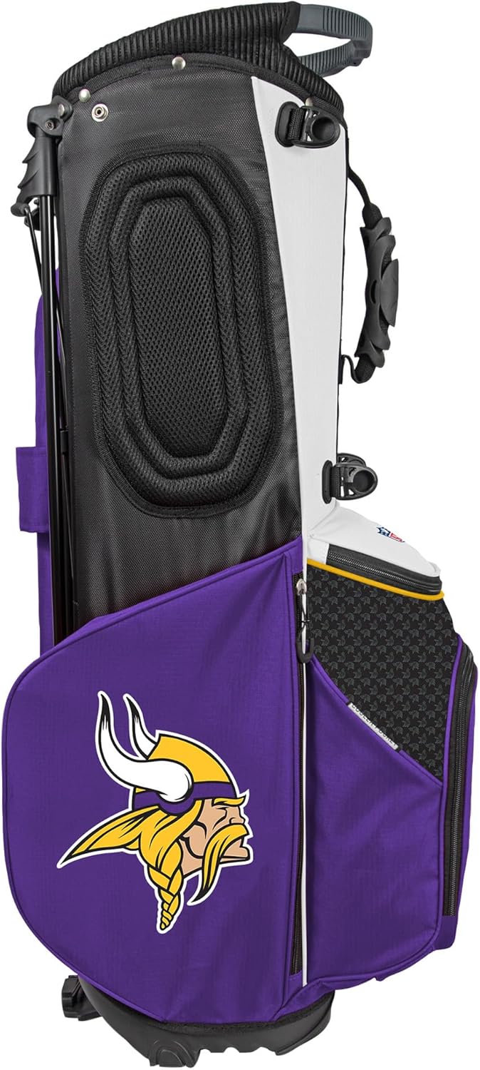 The Back Nine Stand Bag from WinCraft elevates the experience of lightweight carry bags for golfers and team fans. This next generation of golf bags from WinCraft was developed in collaboration with leading golf experts and representatives from professional and collegiate sports teams. This officially licensed bag showcases prominent logos and practical design elements. Weighing 5.25 lbs, it features an 8-way top with full-length dividers for efficient club organization, as well as removable padded shoulder straps for ease of transportation in a cart. The Back Nine Stand Bag combines comfort, functionality, and style, making it a reliable choice for golfers eager to display their team pride on the course for years to come.