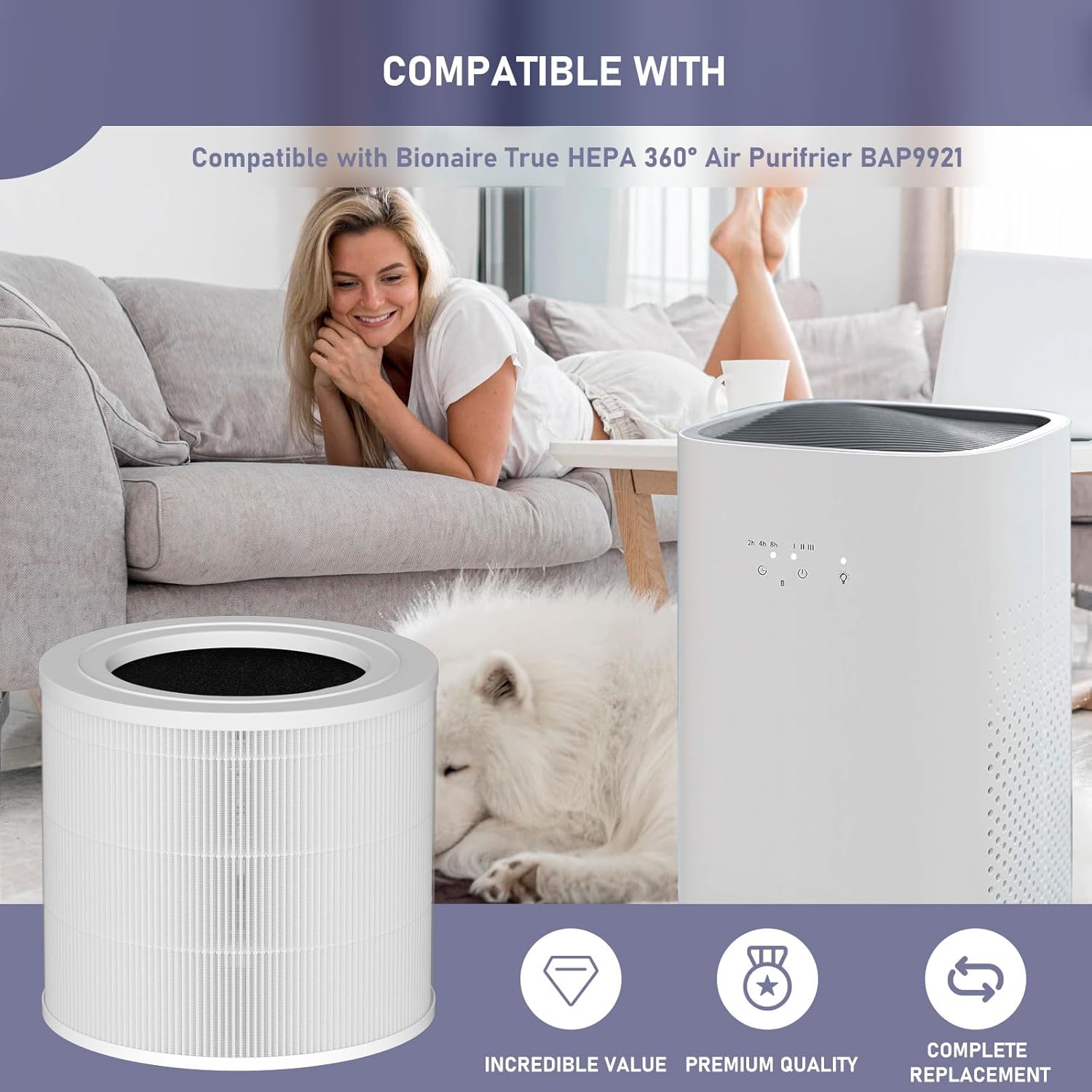 Our BAP9921 True HEPA replacement filter compatible with Bionaire BAP9921 True HEPA 360° Air Cleaner Purifier.PREMIUM FILTRATION:Pre Filter: filters larger particles in the air like dust, hairs, pet fur, lint, and prolongs the life of HEPA filter.True HEPA Filter: True HEPA filtration technology, this filter effectively filter up to 99.97% of particles as small as 0.3 microns, including dust, pollen, pet dander, smoke, and others. Say goodbye to sneezing and coughing caused by poor air quality!High-Efficiency Activated Carbon Filter: Activated carbon filter can effectively filter large particles in the air as well as some odors, such as pet odor, etc. which can effectively protect the carbon layer and HEPA and extend its service life.Package Include 2 x BAP9921 True HEPA replacement filterWarm Tips: It's recommended to replace every 4-6 months, depending on usage and the different air quality in each area.Kindly Notes:This product is a generic filter that is designed to replace the original part. Any brand names or logos are the registered trademarks of their respective owners. Any use of the brand name or model designation for this product is made solely for purposes of demonstrating compatibility.