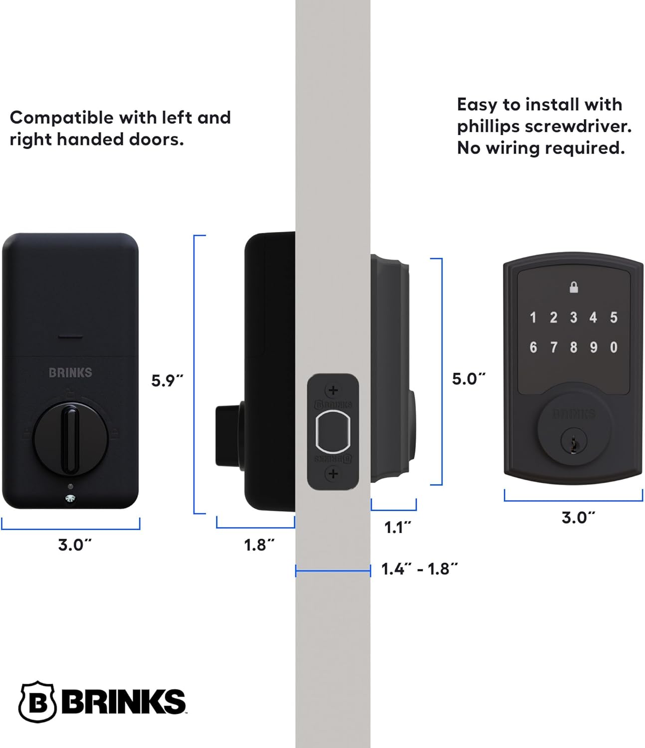 The Brinks Keyless Entry Electronic Touchpad Deadbolt offers a sleek, modern design with a backlit touchpad for easy, keyless entry day or night. It allows you to program up to 50 user codes and 10 one-time codes for flexible access, plus includes 2 mechanical spare keys for traditional entry. Built with advanced security, the lock features an anti-tamper alarm, anti-pry shield, pick-resistant keyway, and a 1-inch deadbolt with a hardened steel anti-saw pin for maximum protection against tampering and break-ins. Powered by 4 AA batteries (included), the lock lasts up to 2 years, offering 2x longer battery life than many competitors. Easy to install with no wiring required, it fits most doors (1-3/8" to 1-3/4" thick) and includes an adjustable latch for 2-3/8" or 2-3/4" backset, making it ideal for both right- and left-handed doors. Whether for front doors, offices, or any entryway, this lock combines keyless convenience, high security, and stylish design for your home or office.