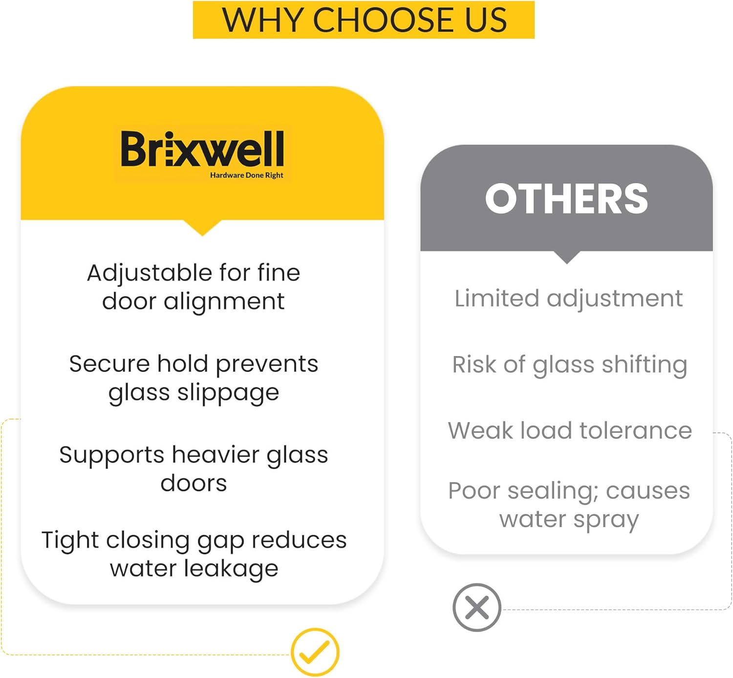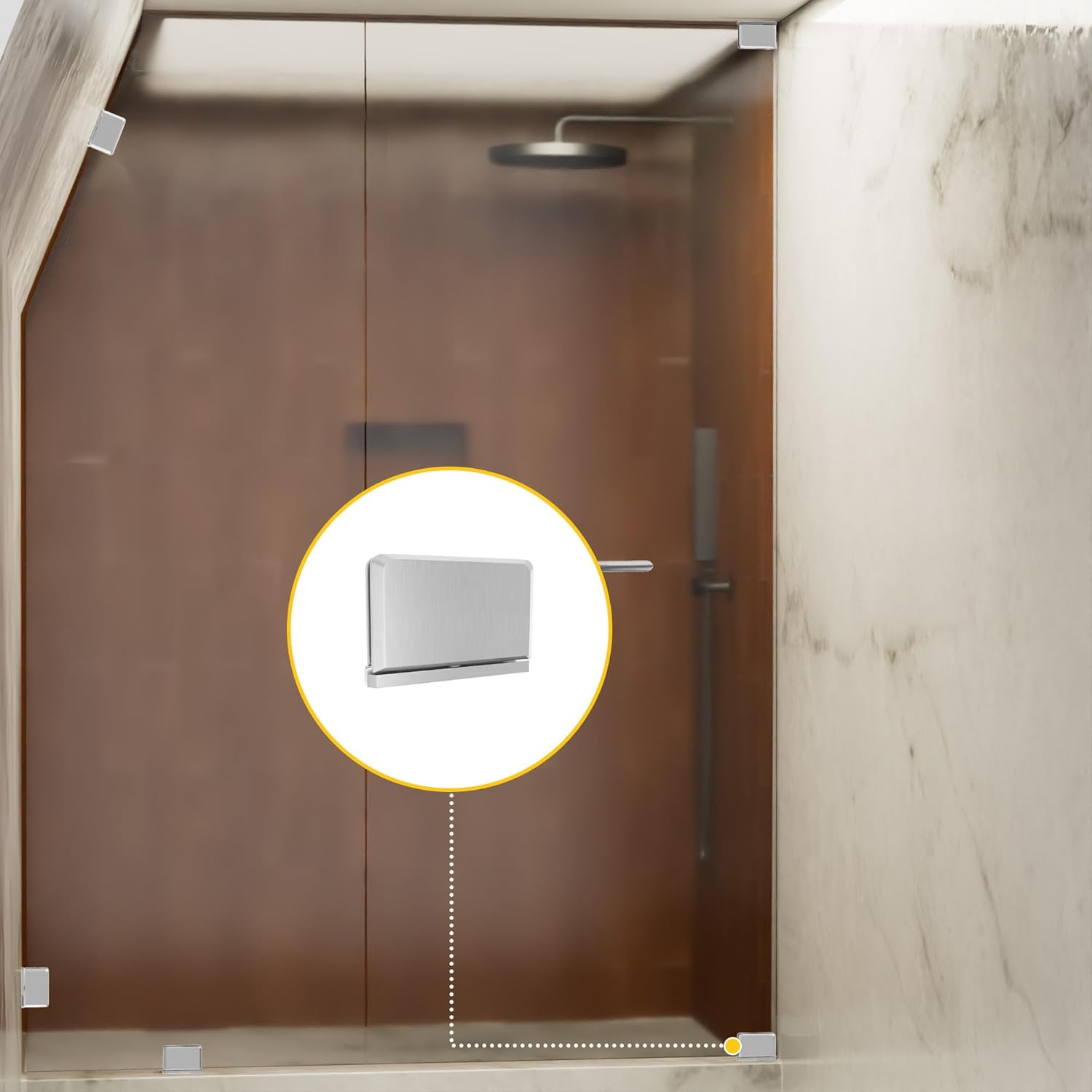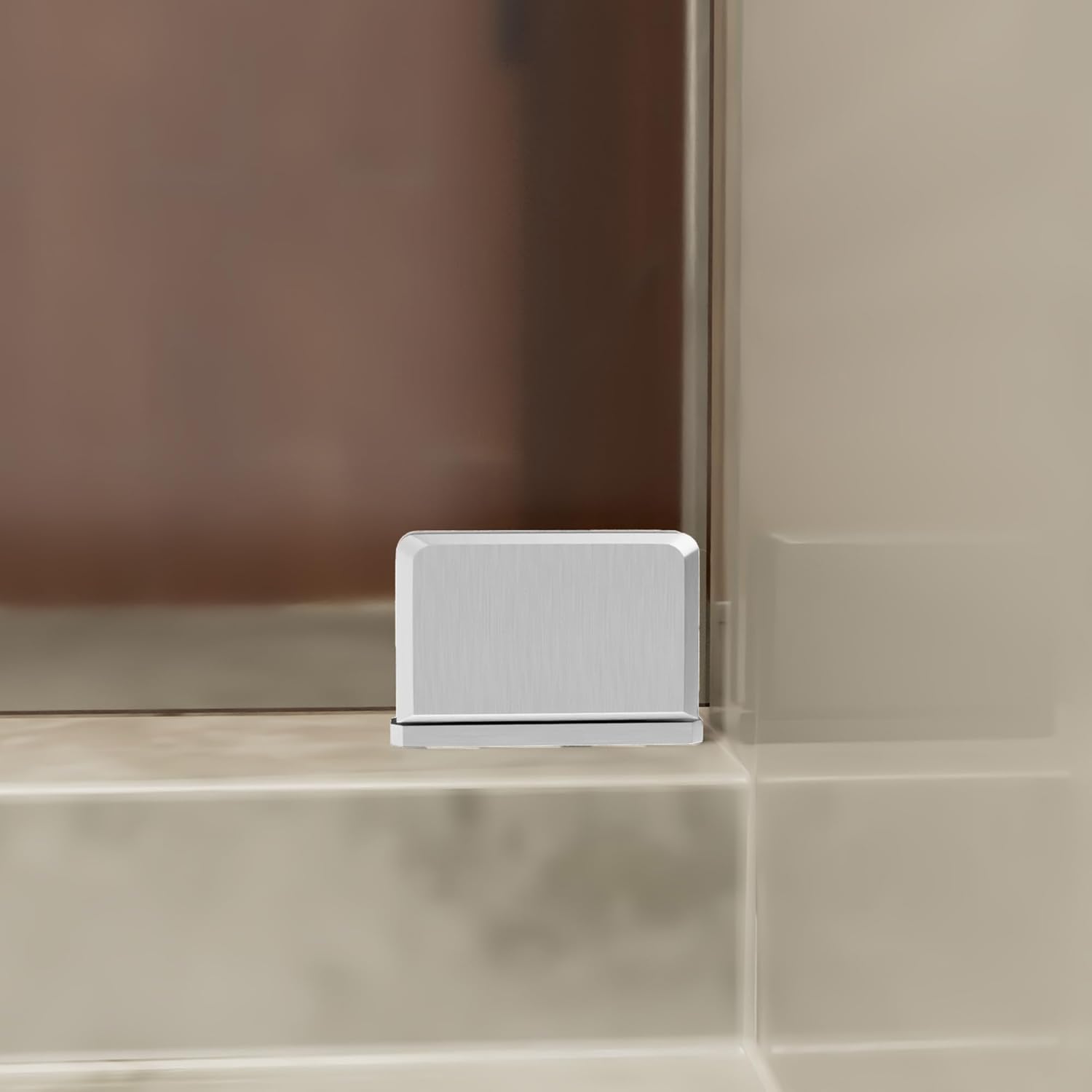 The Brixwell Adjustable Pivot Hinge Glass to Curb Mount in Satin Chrome finish is designed for frameless shower enclosures requiring top or bottom mounting with precise alignment options. Made from solid forged brass with precision-machined stainless steel internal components, this hinge combines strength and functionality for door hardware, shower hardware, and glass hardware applications. It features dual precision wound stainless steel return springs that allow self-centering 0 degree return and self-closing from a 25 degree door angle. The hinge includes an adjustable mechanism, allowing the door closing position to be fine-tuned after installation by loosening two screws with the included 3mm hex wrench, adjusting the door up to 90 degree in or out, and retightening. This feature offers flexibility for installers to align shower doors with existing walls or panels. The hinge is designed for 3/8" (10mm) and 1/2" (12mm) tempered glass. Rated at 40 lbs per hinge, two hinges support doors up to 120 lbs with a maximum width of 36". Dimensions include overall width of 4", overall height of 2-11/16", plate height (cutout step) of 2-1/4", plate thickness of 3/16" per side, base thickness of 11/32", chamfer thickness of 5/64", back plate width of 7/8", and end to end hole spacing of 3-1/8". The non-mouse ear design improves clearance and adjustment flexibility, especially for frameless hinge and pivot hinge installations. The satin chrome finish provides a refined appearance while coordinating with other shower hardware and glass mount fittings. Hardware includes matching finish stainless steel hex clamp screws, crosshead screws, and a hex wrench for installation.