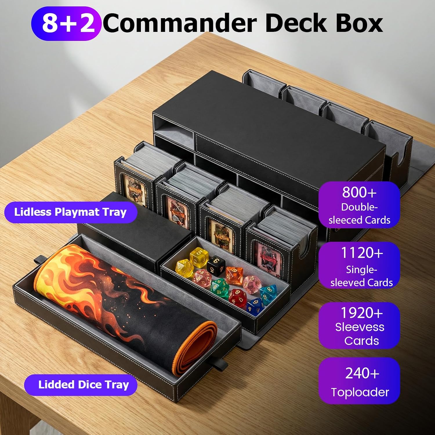 | Included Components | 1 x Commander Deck Box for MTG, 1 x Large and Small Dice Box, 16 x Colorful isolation cards, 8 x Card Storage Box, 8 x Transparent card case |