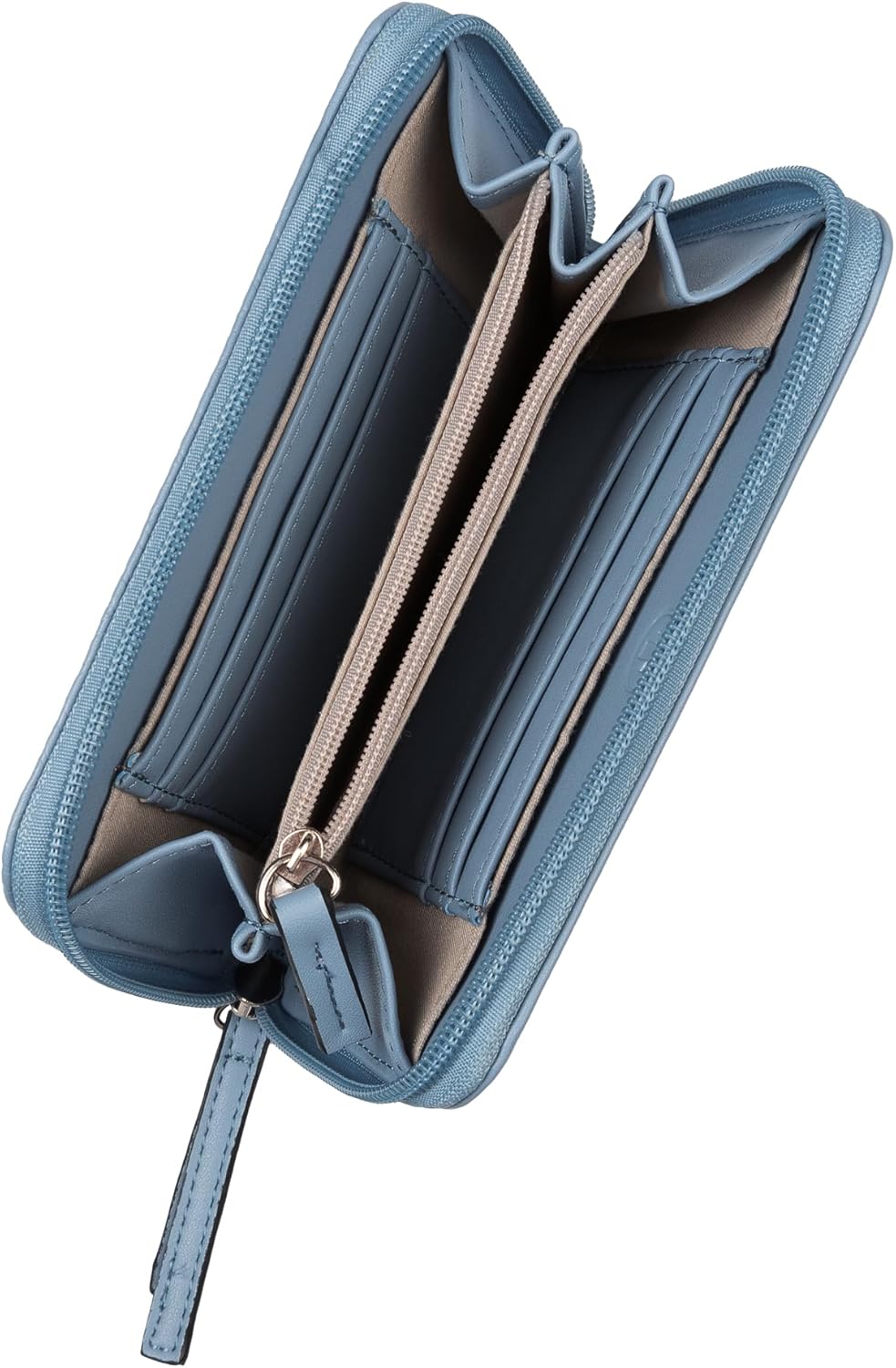 The all-over logo embossing on the front of the bag is a fine contrast to the smooth faux leather and the clear colouring of the Tom Tailor series Mirenda. A straight lines and contrasting edge colour complete the minimalist design. Medium wallet with zip main compartment. Inside 1 zip coin compartment, 6 card slots, 2 note compartments and 2 slip pockets.