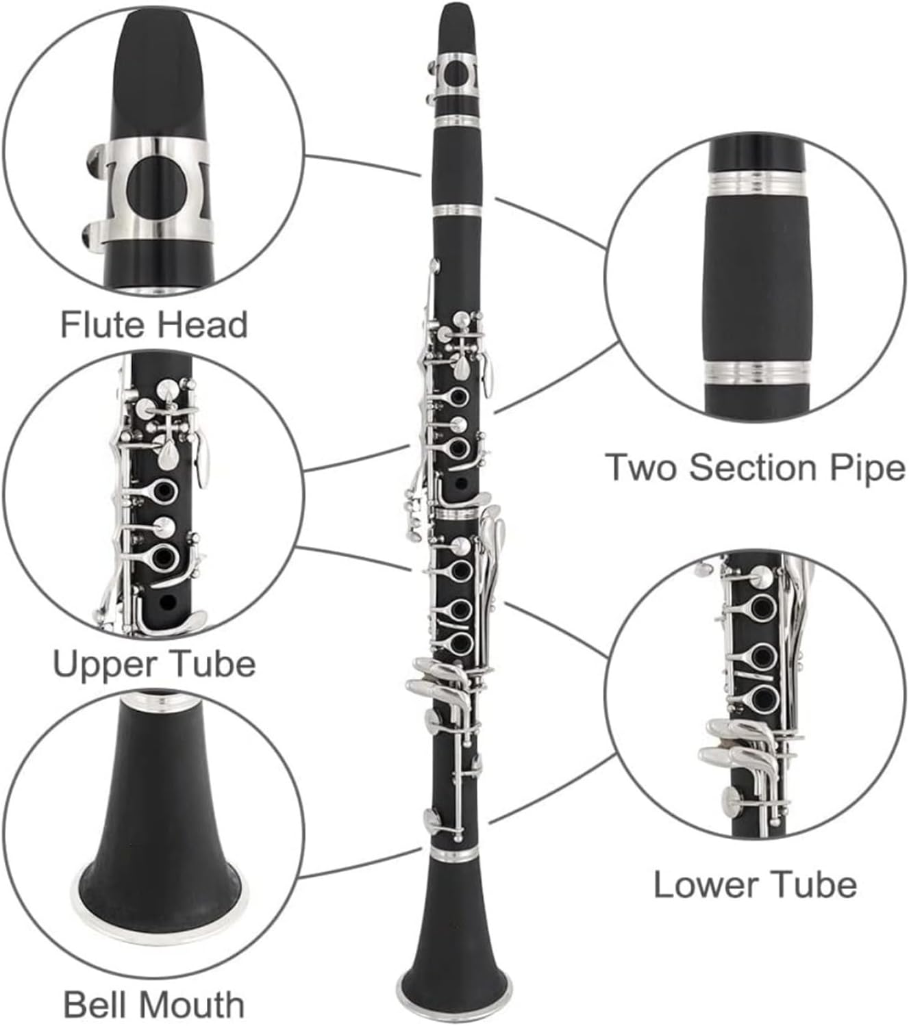 The shape is also very beautiful, the tone is smooth, bright and clear, and full of expressiveness, making it very suitable for professional performance.Packaging: Black bagTone: B flatSurface treatment: Nickel platingProduct name: ClarinetUse scenario: Beginner practice Professional performanceIf you have any questions or suggestions, please contact us and we will answer them for you.