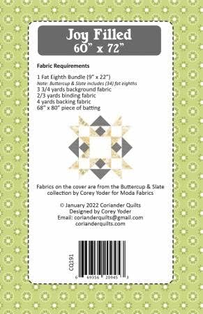 Joy Filled is a full color booklet style pattern. The format of the pattern allows it to work beautifully as a quilt shop block of the month. The quilt finishes at 60" x 72" and utilizes fat eighths. * Printed Paper Pattern * Finished Size: 60in x 72in * Final Product: Quilt * Technique Used: Standard Machine Sewing * Skill Level: Intermediate