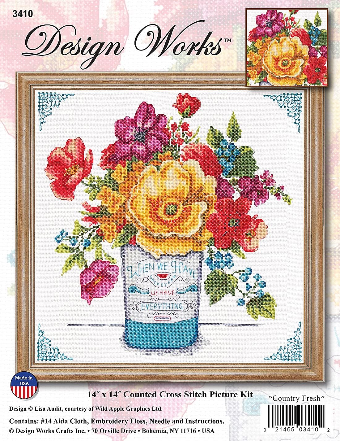 Counted Cross Stitch Kit includes #14 count Aida, 100% Cotton Embroidery Floss, Needle and Fully Illustrated Chart and Instructions. Finished Size: 14" x 14"