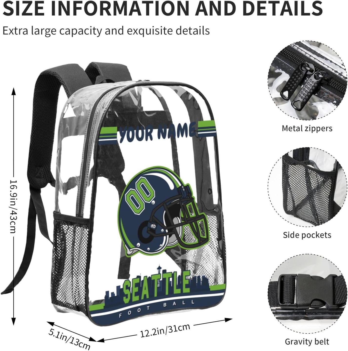 Custom Football Style Clear Backpack From Fitbeckes Create Your Own Personalized Transparent Bag With Your Favorite Name And NumberHow To Custom:1. Click "Customize Now" Button2.Add Your Your Favorite Name And Number3.If You Have Any Feasible Requirements, You Can Add Them In The RemarksSling Crossbody Bag Size:12.25”X 16.9”X 5.1”Multiple UsagesPerfect For Casual Occasions Such As Business Trip, Work,Travel,Hiking, Camping,Climbing,Outdoor Activities, Bike Riding, Cycling,Fishing,Picnic,Etc.In Door, Outdoor, Shopping, Office, Outdoor Sports, Etc. Are Applicable. Both Men And Women Can Use This BackpackWhy Choose Our Products?1.This Personalized Clear Bag Is Made Of High-Quality Transparent Pvc Material, Which Is Not Only Lightweight And Wear-Resistant, But Also Has Excellent Visibility, It Will Meet Any Travel Needs.2.Customizable Clear Bag Features Breathable, Adjustable Shoulder Straps.This Provides Optimal Comfort On Your Shoulders.3.Our Backack Provides A Spacious Space To Freely Arrange The Layout Of Items According To Personal Preferencesty.Basically Can Hold Daily Necessities,It Is Very Suitable For Walking, Traveling,Hiking,Short Trips, Work And Daily Travel.When You Are Troubled By Not Knowing What Gift To Give Your Friend,You Can Choose Our Football Style Backpack. You Can Gift It To Your Father, Mother, Friend, Family, Fans, Husband, Grandfather On Birthdays,Christmas,Halloween,Thanksgiving And Other HolidaysIf You Have Any Questions About This Custom Backpack,Please Feel Free To Contact Us.We Will Give You A Satisfactory Answer And Help Within 24 Hours. Wishing You A Happy Life Every Day