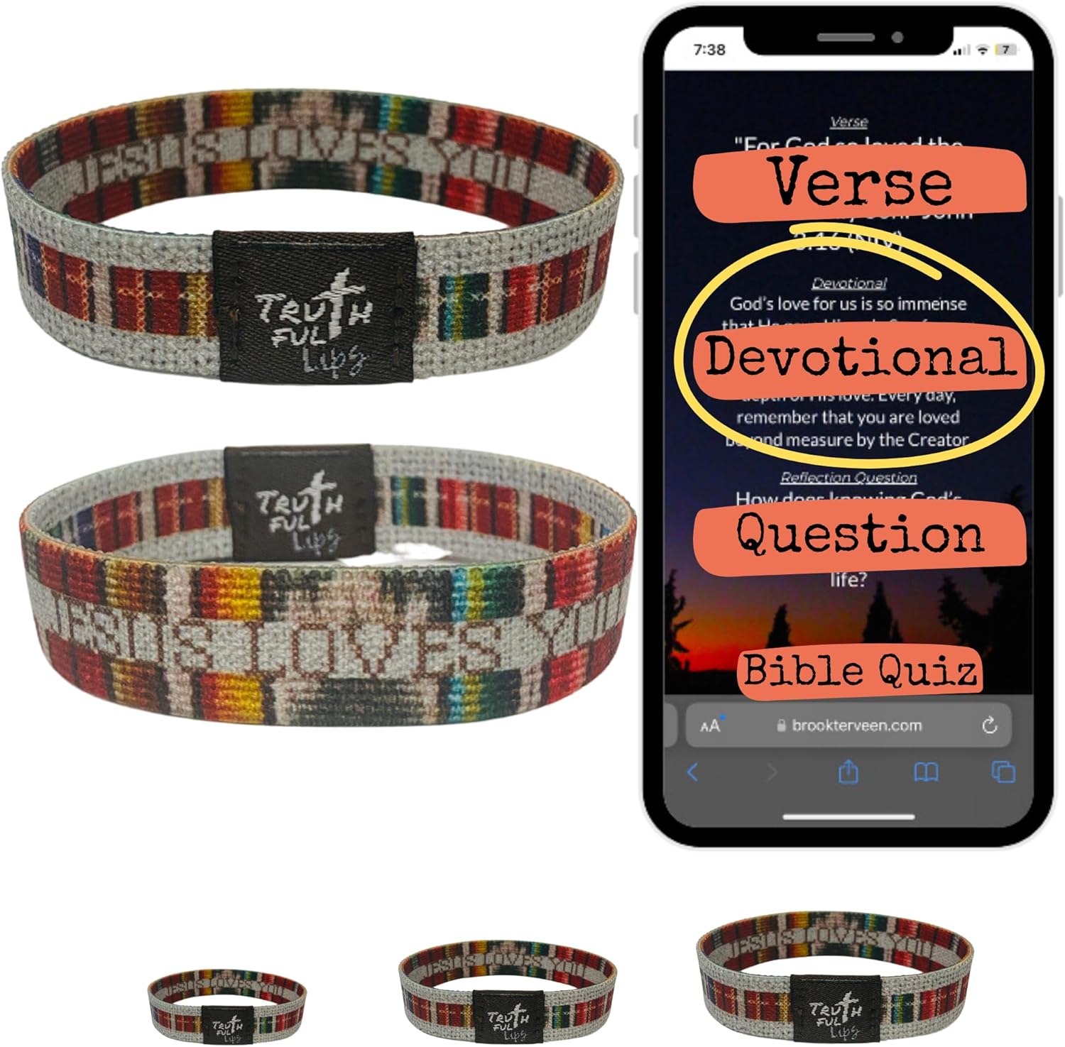 Truthful Lips WWJD Bracelets; Tap your iPhone or Android with the bracelet's logo for a verse, devotional, and reflection question daily. Feed your soul with His Words directly on your phone. No need for any papers to carry around. Color options coming soon. The bracelets use an NFC chip that reads to your smart phone and pulls up an updated website daily. They come in 3 sizes: small (6in), medium (7in), and large (8.5in) COLLECT 3 AND GET 1 FREE **MUST BE SAME SIZE How It Works: Seamless Integration: Simply tap the logo on your bracelet with your iPhone or Android phone. Daily Nourishment: Receive a carefully selected verse, an insightful devotional, and a thought-provoking reflection question directly to your device. Spiritual Growth: Engage with His Word daily and experience spiritual growth and reflection. Why You'll Love It: On-the-Go Inspiration: No matter where you are, a moment of spiritual connection is just a tap away. Stylish and Functional: Wear your faith with pride while enjoying the comfort of our high-quality elastic bands. Perfect Gift: Share the gift of daily devotion with friends and family who seek to deepen their faith. Embrace a new daily routine that feeds your soul and strengthens your connection with His Word. Transform your spiritual journey with the Daily Devotional Bracelets today. Order Yours Now and step into a daily practice of reflection and inspiration. With our Bible verse bracelets, you can wear your faith proudly and remind yourself and others of the teachings of Christ every single day! Related Keywords: Jesus bracelets, daily bible verse bracelet, yappy bracelets bible verse, bible verse bracelets, christian bracelet, christian bracelets, faith bracelet for women, faith over fear, God bracelet, i am second bracelet, Jesus bracelet, Jesus is King, WWJD bracelet, wwjd bracelets for men, wwjd bracelets women, God bracelet for men, God is greater than highs and lows, God is greater than the highs and lows, Jesus Bracelets for men, Prayer bracelet, prayer bracelet for women, scripture bracelets, Bible bracelet, Bible bracelets, Bible bracelets scan, christian daily bible verse bracelet scan, christian men bracelet, christian verse bracelet, daily bible bracelet bundle, daily bible verse bracelet nfc, daily bible verse bracelets, daily devotional bracelet, devotional bracelet for men, devotional bracelet for women, nfc scripture bracelet, prayer bracelets, prayer bracelets for women, reflections bracelet, reversible bible bracelet, scan bracelet for bible verse, scannable bible verse bracelet, scripture bracelets scan daily qr code, the bible bracelet, tiny devotions bracelet, wearable bible band, wearable bible bracelet wearable bracelets with nfc daily bible verse, wearable bible verse bracelet, Audio bible bracelet, bible bracelet for women, bible for bible quote bracelets, bible verse bracelet, bible verse bracelet for men, bible verse bracelets for men, bible verse bracelets scan phone, bible verse bracelets tap phone, bible verse braclet, bible verse braclets, bible verse devotional bracelets, bible accessories women, daily bible verse bracelet, jesus bracelets, bible bracelet, bible bracelets, bible bracelets for women, bible verse accessories, bible verse bracelets for women, bible verse bracelets tap phone, bible verse braclets, God is greater than my highs and lows. bracelet bible verse, bracelet bible verse daily, bracelets bible verse, bracelets with bible verses, bracelet that gives bible verse everyday, bracelet with bible verse