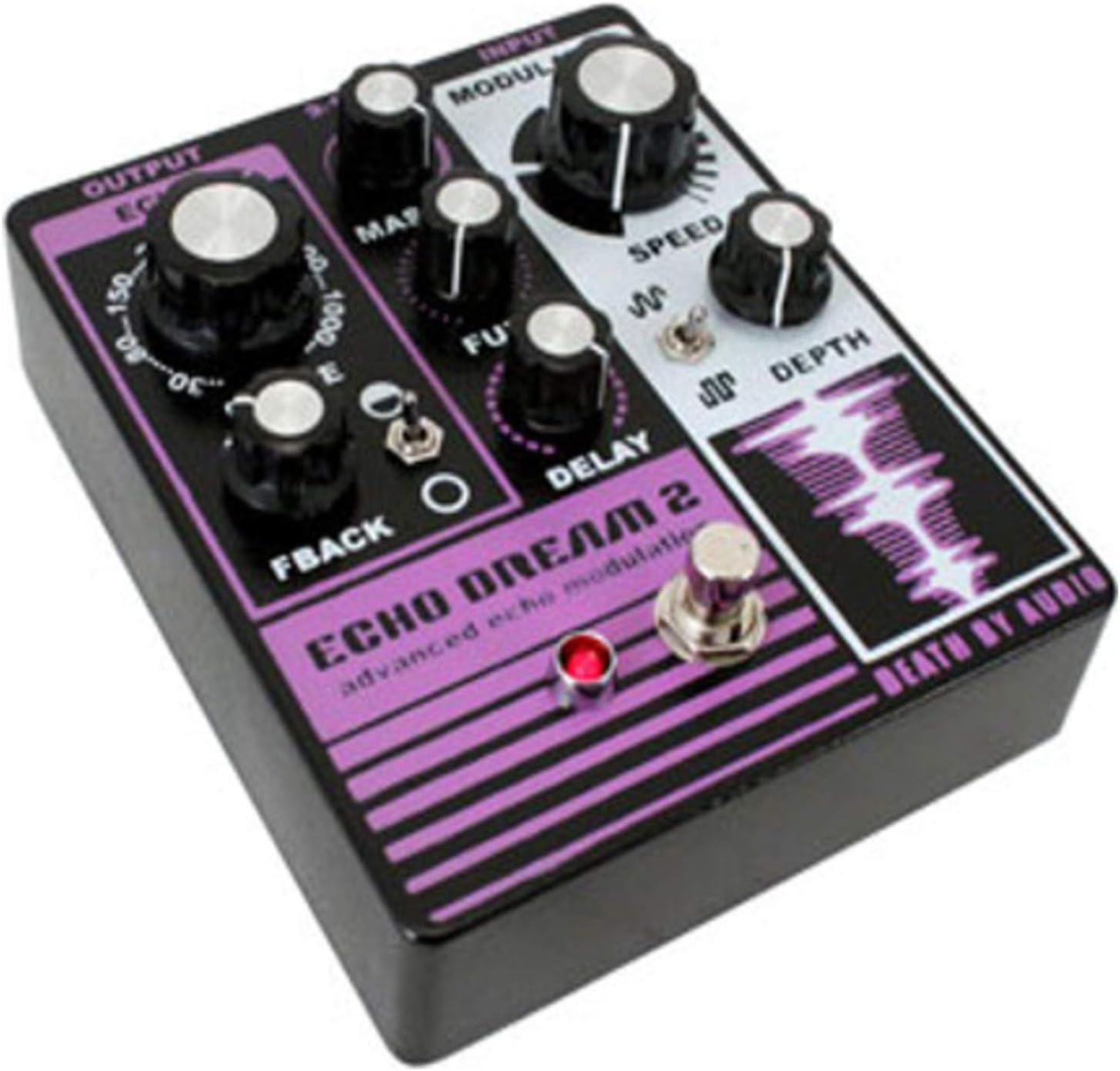 The Echo Dream 2 is an updated version of one of Death by Audio s most popular pedals, delivering 20 to 1,200 milliseconds of great sounding echo, with fuzz, and fully controllable pitch shifting modulation, all in a single pedal. Controls for Delay Time, Feedback, and Delay mix give you a beautifully ethereal echo. Flip the Wet/Dry toggle for an adjustable blend of delay and dry signal up to a 50/50 mix, or an all effects signal for use with a mixed loop. Turn the Fuzz control for the full sweep of dirt from clear to overdrive to all out fuzz. Then adjust the modulation Speed and Depth for the perfect level of expansive, pitch-shifting color, and flip the toggle for sine or square wave operation. The Echo Dream 2 draws only 40 milliamps when used with any standard 9v battery, but we recommend any standard negative center 9vDC power supply that can deliver 18 volts for even better clarity, tone and headroom.