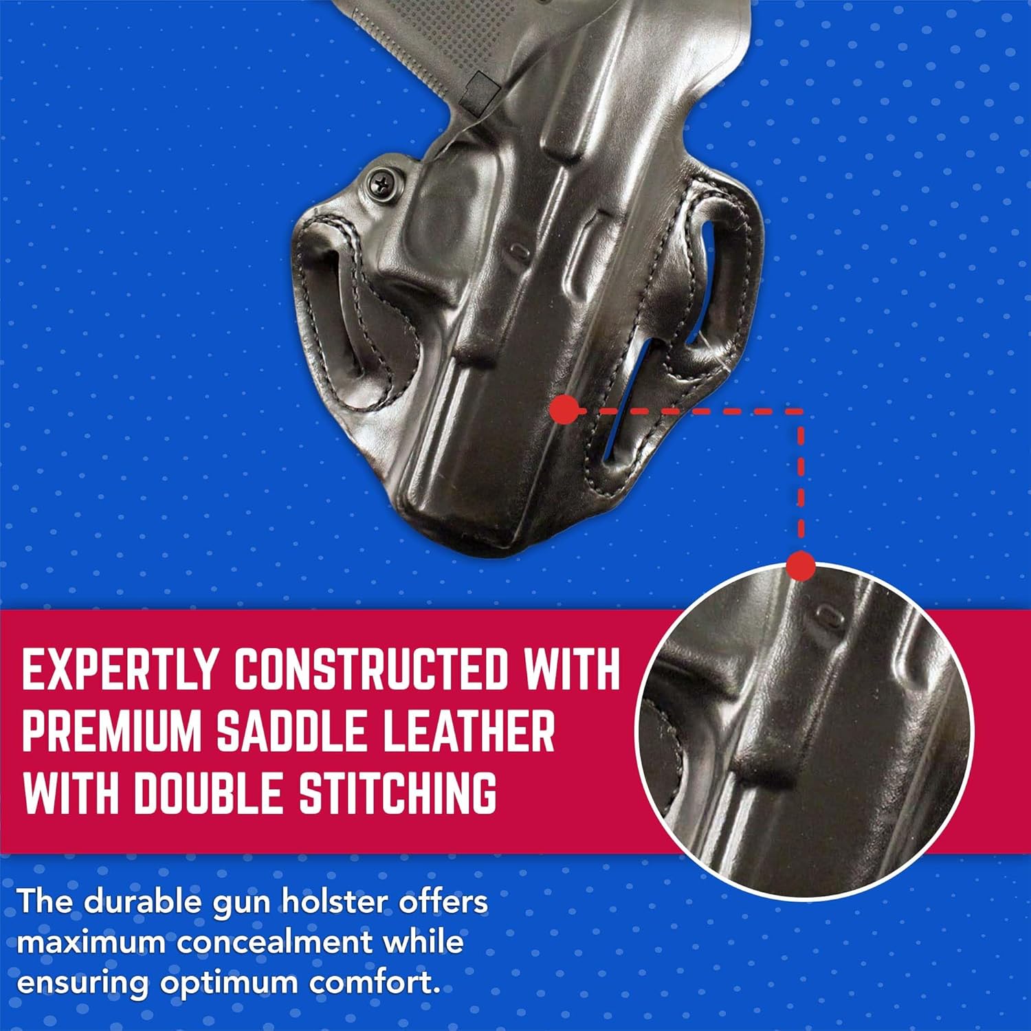 The firearm rides high and is presented at an optimum draw angle. Its thumb break and exact molding, together with a tension device, allows for a secure and highly concealable carry. Belt slots are 1-3/4 inches wide. Some models with two belt slots and without tension device.