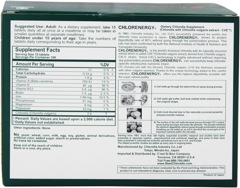 Chlorella is a source of several nutrients vital to human health, including vitamins, minerals, protein and more. Contains no yeast, wheat, corn, milk, egg, soy, gluten, animal derivatives, artificial color, added sugar, starch or preservatives.
