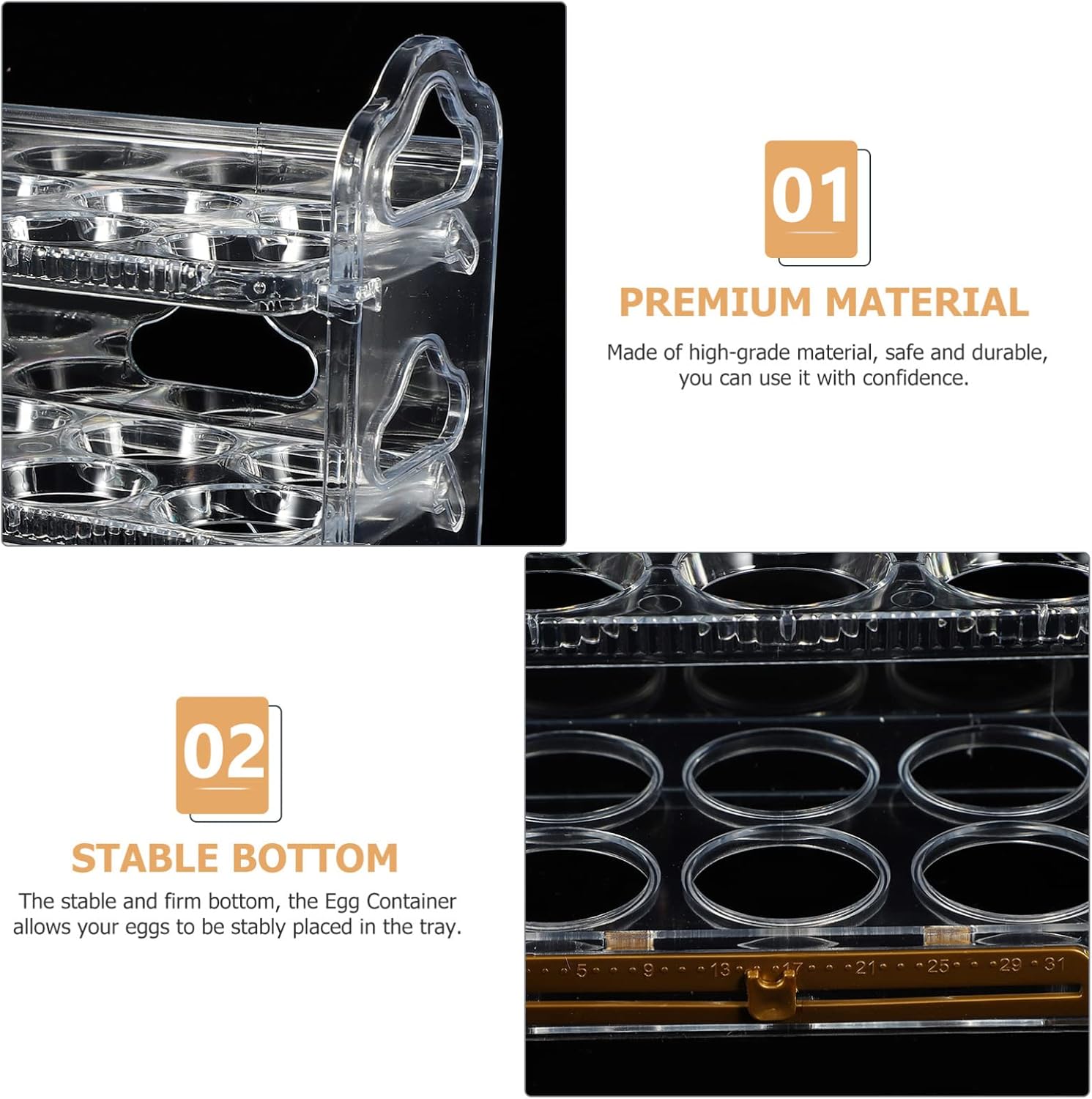 Description Clear Egg Storage Container with Flipped Tray Stackable Egg Fresh Storage Box Egg Storage Rack Fridge Large Capacity Egg Holder for Fridge Space- saving Kitchen Preservation Tray Features- Material: PET, PP- Size: 25.5X20X10CM.- Color: Transparent. Package Including 1 x Egg Holder