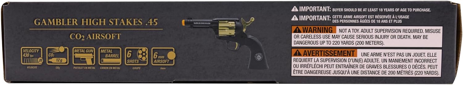 If you need a unique piece to round out your airsoft collection, look no further than the Legends Gambler High Stakes Single Action Army (SAA) CO2 powered airsoft revolver from Elite Force Airsoft. This SAA is a winning hand with a sexy black finish on the frame and barrel, accented by a gold finished trigger, hammer, and cylinder, then topped off with matte black grips with a silver medallion embossed on each side. This airsoft 6-shooter is powered by common 12g CO2 (not included) and launches .20g BBs at 380 FPS. Holster one of these great looking airsoft revolvers and turn heads as you enter into a dual of the most eye catching airsoft guns from one of the most popular names in airsoft—Elite Force.