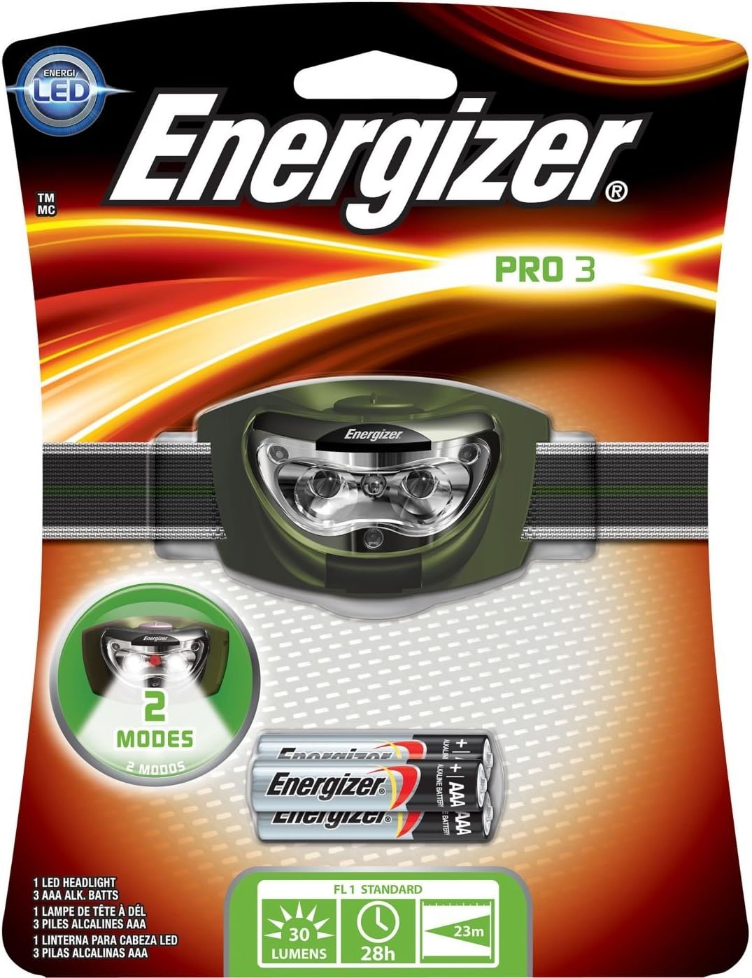 2 white LEDs for illumination and 1 red LED for night visionAdjustable hands-free swivel headlamp with 3-position slide switch Pivoting directional light with shatterproof lens50 hours run time on 3 AAA batteriesIncludes 3 Energizer AAA batteries