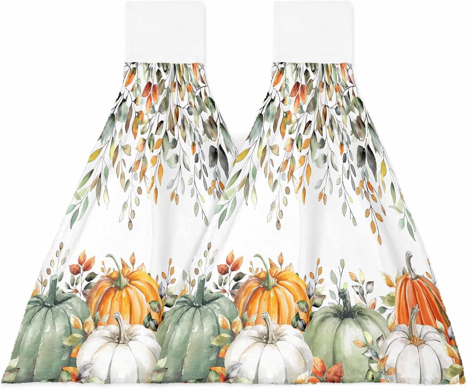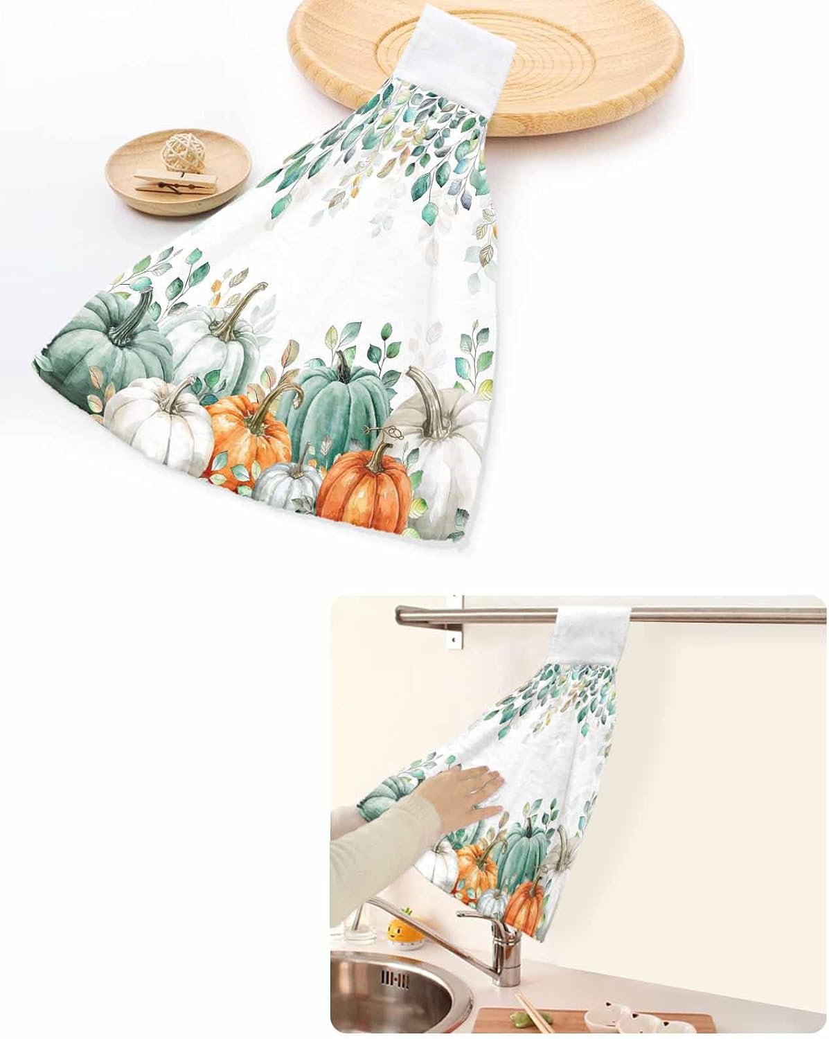 Fall Thanksgiving Hanging Tie Towels Set Daily Decor for HomeProduct DescriptionSize Dimensions:Each Hand Towel 18x14 Inch. Print: Single-sided printing, one side is a beautiful pattern, the other side is white.Durable & Absorbent MaterialThe hand towels for kitchen are made of absorbent microfiber, lightweight, highly absorbent, quick-drying making them perfect for cleaning and suitable for all your household tasks.Unique Hook & Loop DesignThe convenient hanging design keeps towels from sliding off onto the floor. Easy to hang anywhere ideal for daily use. The soft bath wash towels will not take up any space and is also convenient to carry.Ideal Kitchen AccessoriesOur dish towels will refresh your kitchen, is easy to mix and match with other kitchen decorations. Add flair to your kitchen decor with colorful kitchen dish towels.More Scene UsesBoth decorative and practical, it is an ideal choice for your kitchen, restaurant, hotel, coffee shop, dessert shop, bathroom, toilet tabletop and other occasions. Great for drying off dishes, these versatile towels are perfect for wiping your hands, cleaning up kitchen counters, carrying hot dishes, and much more. They can be hung anywhere after use.Vibrant Pattern & Thanksgiving GiftOur hand towels come in a variety of vibrant colors and patterns for each season and occasion. Give your space a real personality, the perfect gift for various holidays.Easy CleanMachine washing in cold, do not bleach, tumble dry low and low iron if needed.