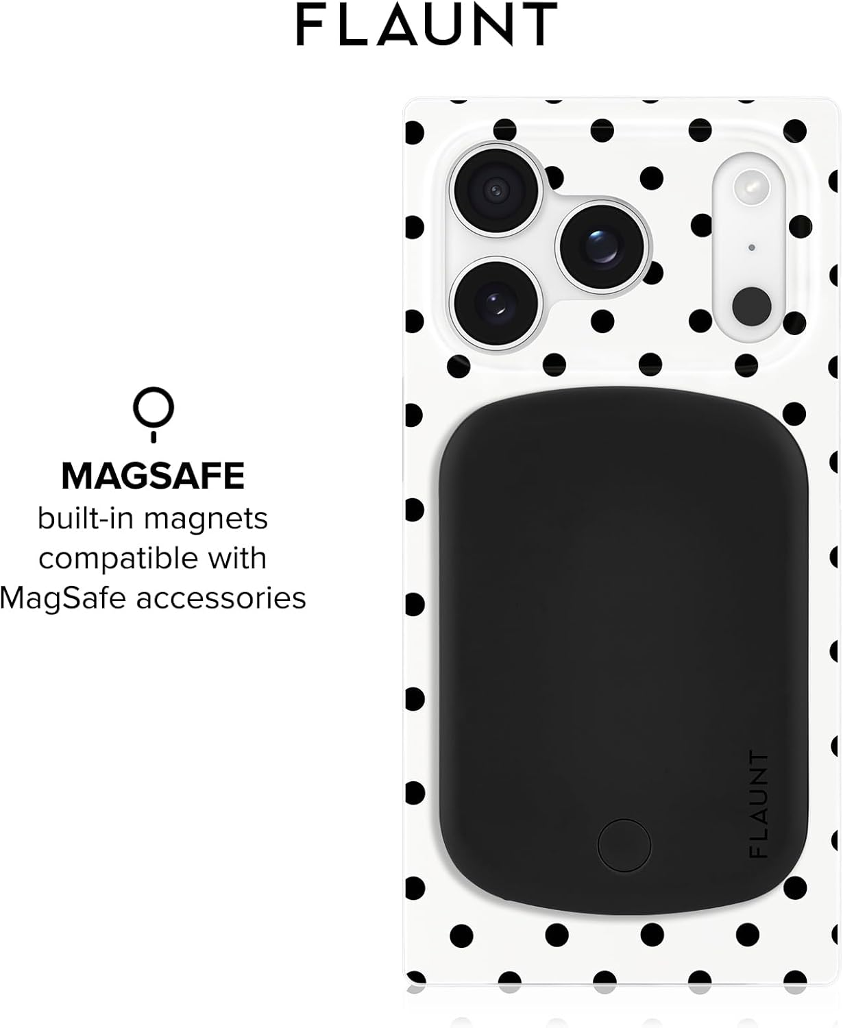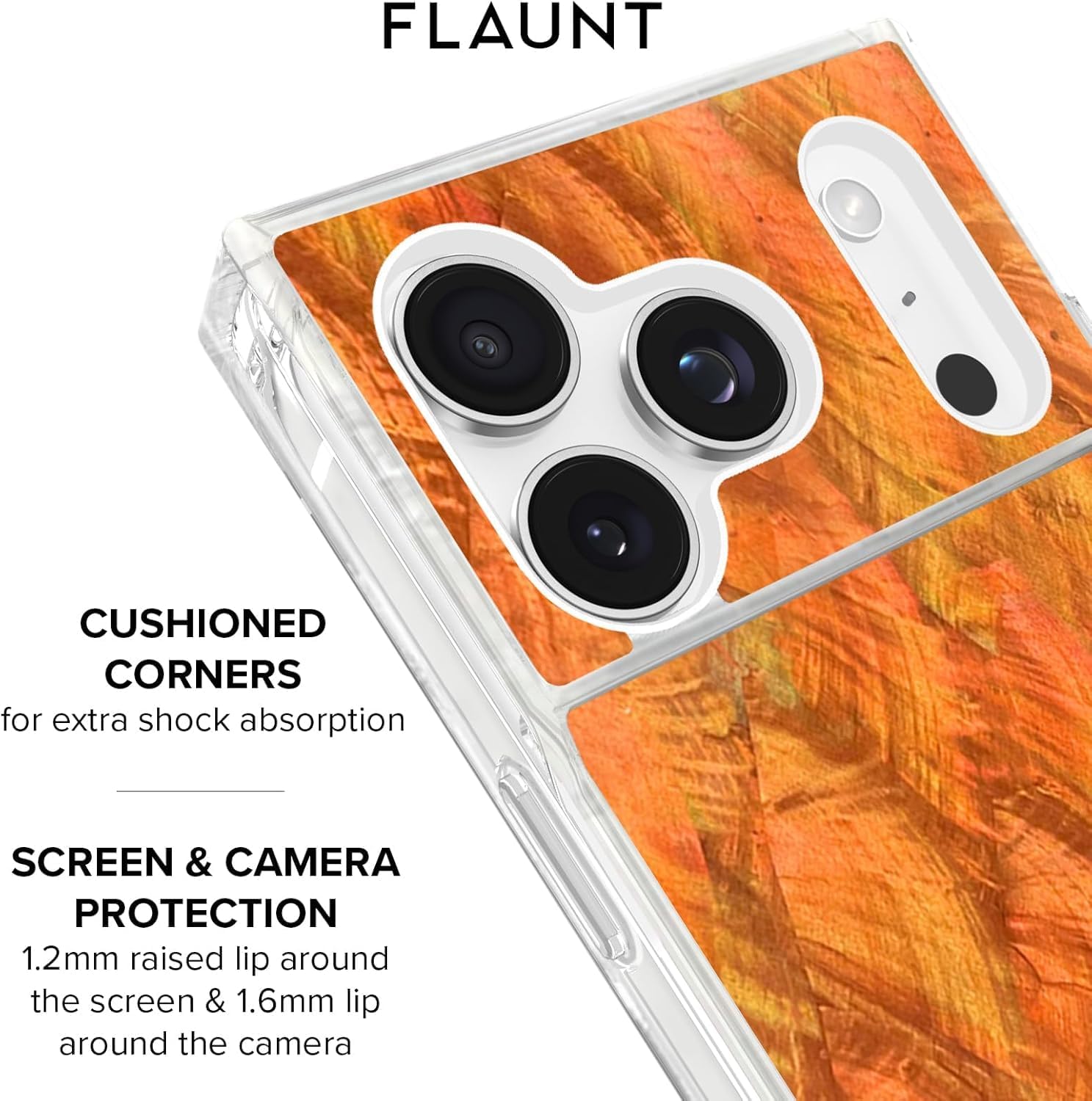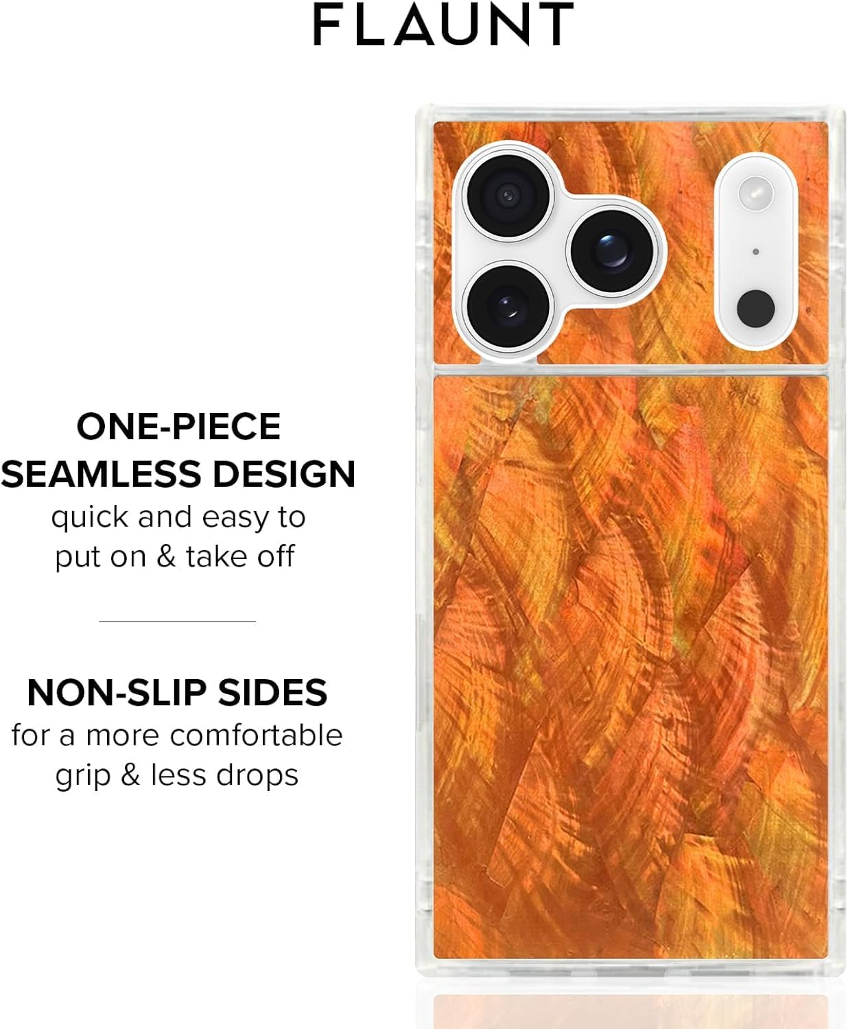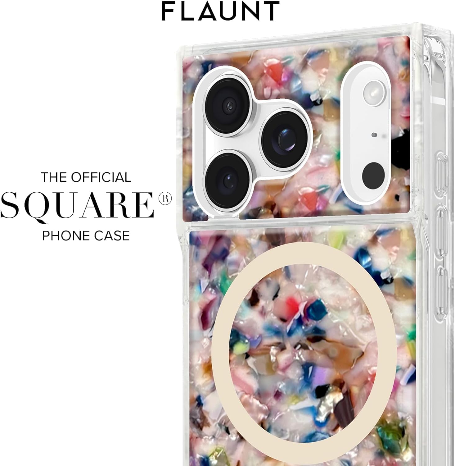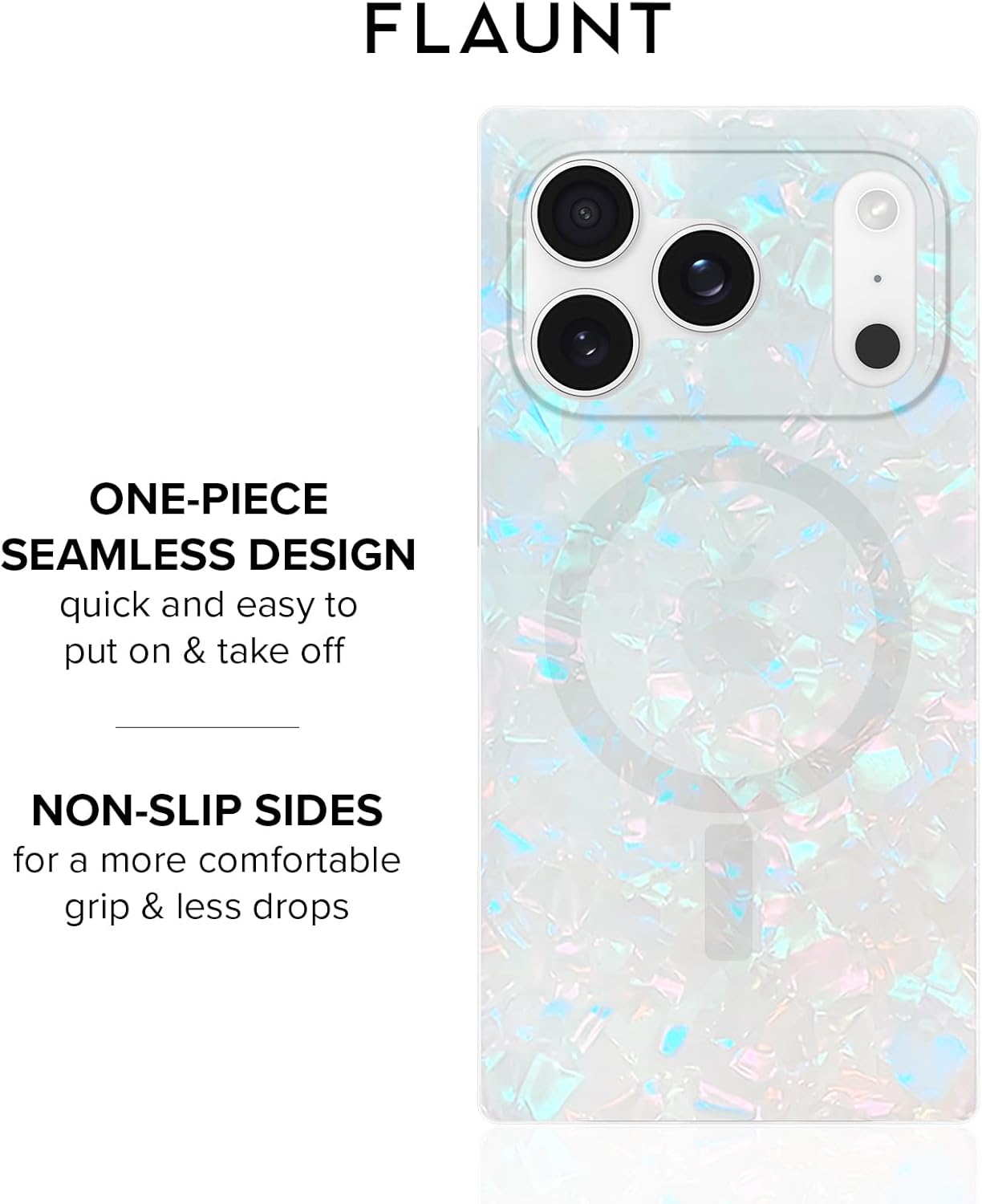 The FLAUNT SQUARE Protective Case for iPhone 16 Pro Max combines functionality and luxury with its unique SQUARE design and iridescent satin finish. Offering a slim, shockproof build, it provides superior protection against drops of up to 12 feet while maintaining a lightweight profile. Perfect for everyday use, it fits seamlessly with MagSafe accessories, ensuring you stay connected and powered throughout the day. Elevate your phone’s look with a SQUARE case that blends both fashion and protection seamlessly.FLAUNT SQUARE Protective Case Features:Iridescent Satin Finish for a Luxury AestheticOfficial SQUARE Design12ft Drop ProtectionFull MagSafe Compatibility for Easy Charging and AccessoriesPremium Durable MaterialsSlim Profile for Lightweight, Comfortable GripPrecise Cutouts, Fit for iPhone 16 Pro MaxAnti-Scratch Coating1 Year WarrantyWho Are We: FLAUNT is a fashion-forward brand that combines style and functionality, offering trendy and high-quality SQUARE phone cases for those who love to showcase their personality while ensuring maximum protection for their devices. FLAUNT’s collection includes a variety of sleek, chic, and durable cases, designed to suit every occasion and every mood. With a focus on providing both aesthetic appeal and practical features, FLAUNT SQUARE cases deliver reliable protection while complementing your style.