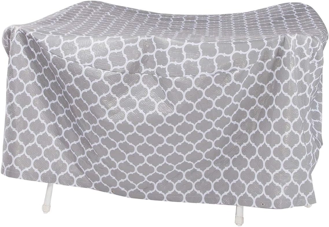 Designed in premium quilted vinyl with metal grommets, this weatherproof cover shields your patio table set from outdoor elements, year round. Offering quality protection from rain, snow, dirt, tree sap and damaging sunlight, the generous, form-fitting cover slips over a round table with chairs--helping extend the life of your furniture investment. Designed in a beautiful trellis pattern to enhance any outdoor setting, the durable quilted vinyl wipes clean with a damp cloth. Tie-down straps not included. 30"high x 84" dia.