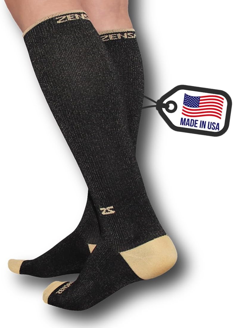 The copper compression socks are Great for everyone from travelers to nurses. The compression socks contain special copper nylon that help to prevent the buildup of odor, while also providing natural wellness and skin enhancement. The graduated compression technology helps to improve circulation and blood flow. This helps to prevent blood from pooling in the ankle areas - a common problem during long term flights. The compression in the travel socks also help to provide support to the lower legs. A seamless toe box prevents blisters and irritation, ensuring an optimal fit. The compression socks are not just for traveling. Anyone on their feet for long shifts, including nurses, Cooks, waiters, and more are able to benefit from the Zensah copper compression socks - helping to keep their feet energized all day or night. Expecting mothers are able to use the copper socks as maternity compression socks to help reduce the appearance of varicose veins and alleviate restless leg syndrome. Men: s: 4 -6.5 M: 7 - 9.5 L: 10 - 12 5 women: s: 5 - 8 M: 8.5 - 11 L: 11.5-14