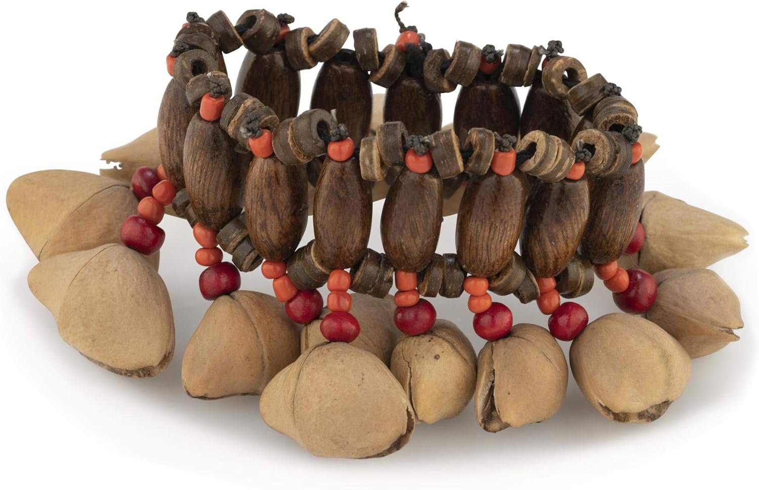 Pearl's Kenari Nut hand shaker creates a robust woody tone that will add texture to a variety of musical styles. The shaker features a 5" looped handle connected to 22 strands of Kenari nuts. Each strand holds 6 hand tied nuts on nylon cordage. The Kenari nut's hard exterior and hollow, triangular shells become miniature sound chambers when played.