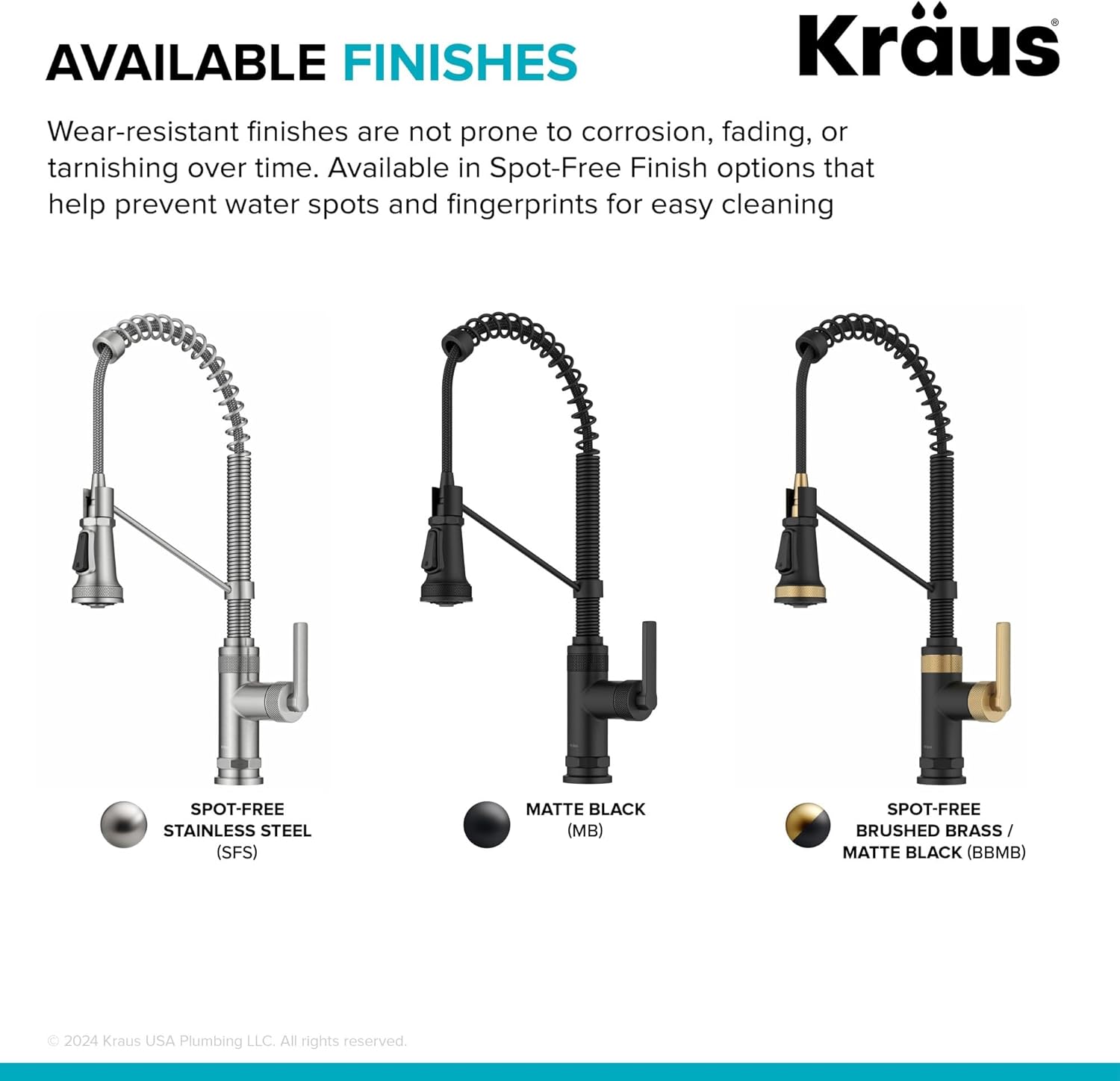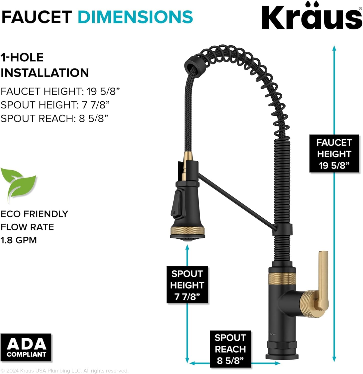 Add a stylish industrial touch to your kitchen with the Allyn Commercial Kitchen Faucet, featuring an open-coil spring spout with hexagonal bolts and diamond-knurled accents for a bold yet refined look. The kitchen faucet with pull down sprayer and swivel adapter offers extended range of motion all around the sink. 2-function pull down faucet sprayhead with stream and spray has soft nozzles that allow you to wipe away mineral buildup. ADA-compliant kitchen sink faucet handle works with 90-degree forward rotation for installation in tight spaces. Pre-attached water lines and mounting hardware included for easy DIY installation. Wear-resistant finish is not prone to corrosion, with Spot-Free Finish options that simplify cleaning, and a beautiful split finish option for a bold modern look.