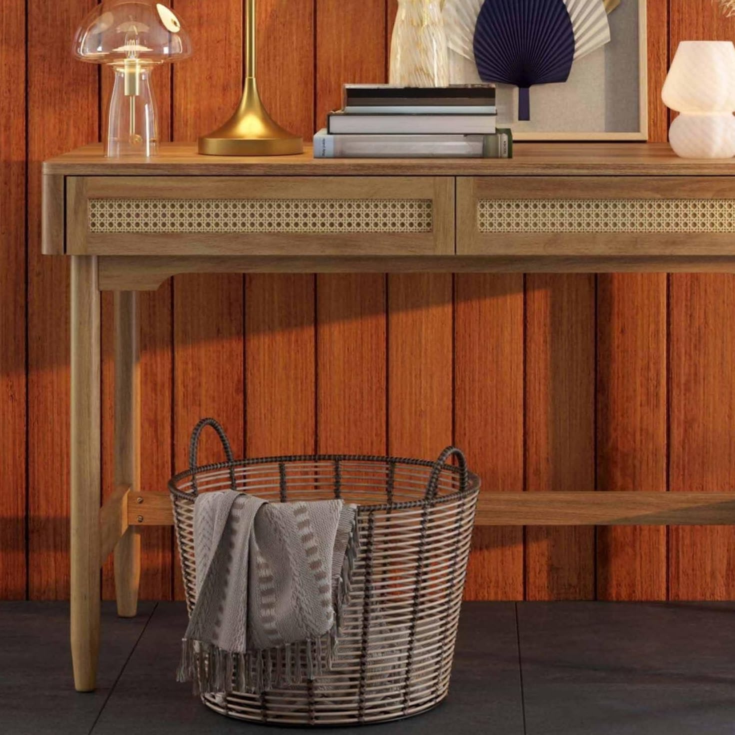The chic Large Poly Rattan Storage Basket with Handles provides a stylish way to store and display your favorite throw blankets, pillows, and other home décor. It is handcrafted of poly rattan over a sturdy iron frame and features reliable handles for easy carrying. Finished in sleek brown tones, this basket blends well with any décor.