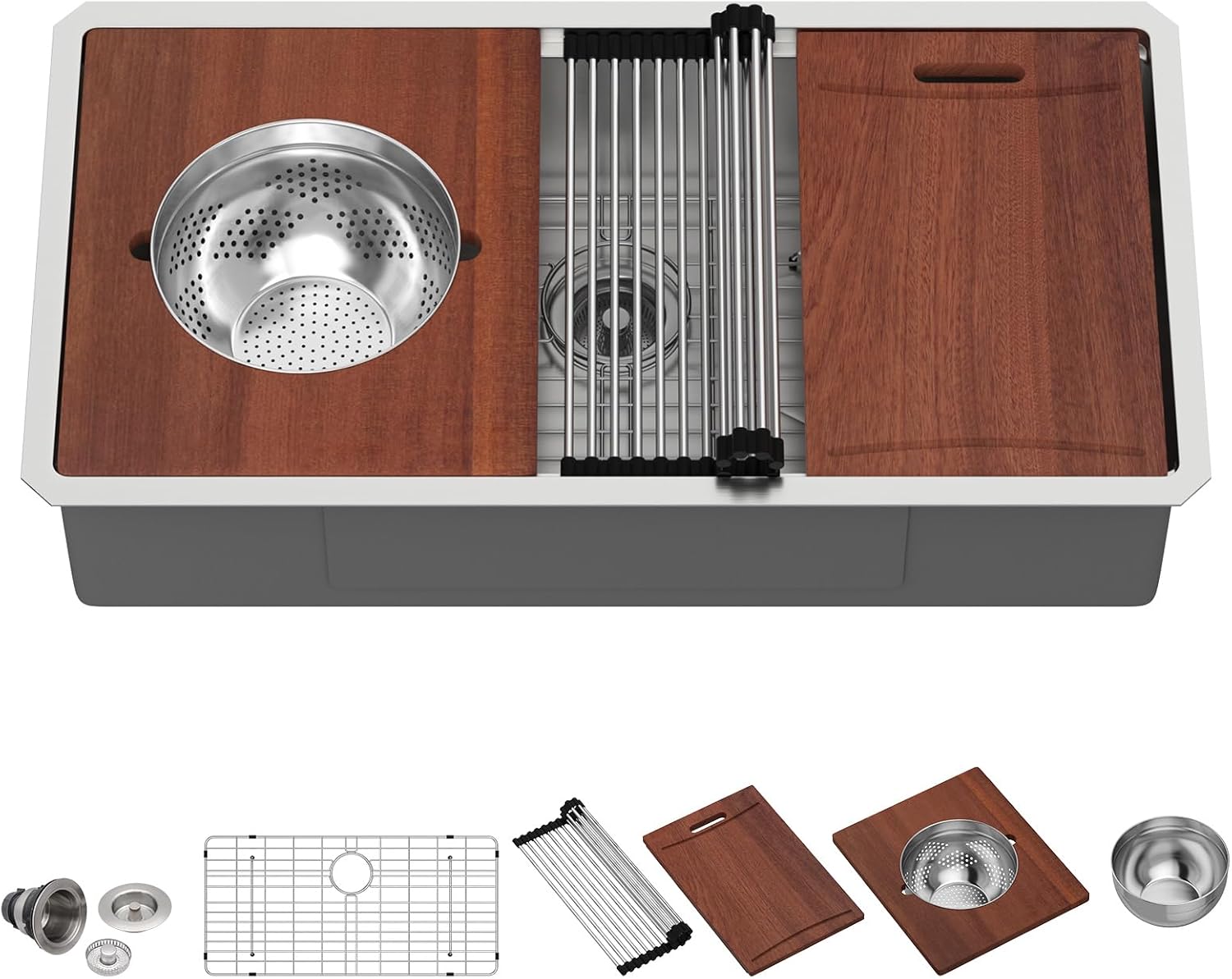 | Included Components | bottom grid, clips & cutout template &instructions, drain assembly, kitchen sink with cutting board, mixing bowl & pasta strainer |