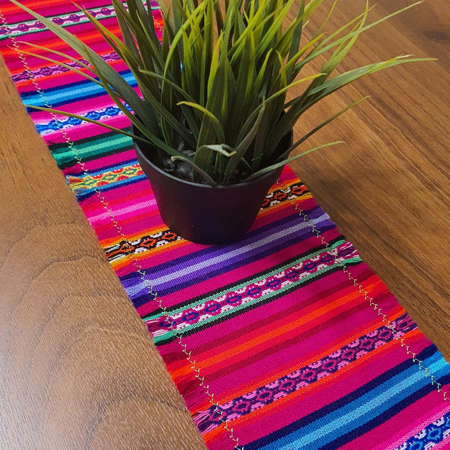 Handcrafted from medium-thickness artisan textiles, these narrow table runners bring authentic Andean warmth to your space. The vibrant fuchsia background is woven with traditional multicolored Inca patterns, making each piece a bold yet soulful accent. Finished with fringes along the length and clean, straight edges on the short sides, they’re ideal for adding texture and color to shelves, consoles, dressers, or coffee tables—any surface that deserves a handcrafted touch. Measure: 6" × 47" inches (15cm × 1.19 mt; 0.5 × 3'9" ft in)