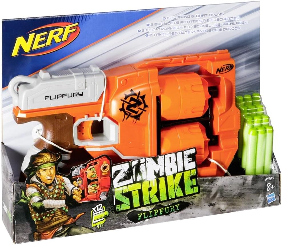 Unleash a sweeping zombie-blasting defence with this hard-core Zombie Strike FlipFury blaster. The blaster's two flipping drums hold six zombie strike darts apiece and lets one fire up to 12 darts without reloading. Load up both drums with the included 12 zombie strike darts and hit the streets to wipe out those lurching, staggering zombies. One can clear the battlefield with Flipfury blaster.