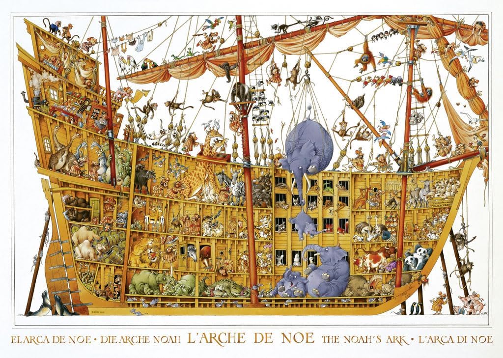 Product Description A 2000 piece triangular puzzle manufactured in Germany by the famous Heye company. Noah's Ark is a striking image created by the popular cartoonist Loup. For fans to top class fun and puzzle art, this extraordinary puzzle brings together the most sought after masterpieces by the one of the best Cartoonists. Delighting the viewer with humorous details, these puzzles are a unique and timeless treat. This puzzle is a must have for any puzzle lover and makes for a rewarding and challenging puzzle experience. This puzzle is made from high quality card and comes presented in a triangular box which has been shrink wrapped for further protection. Finished puzzle measures 680mm x 960mm. Set Contains: 2000 piece puzzle