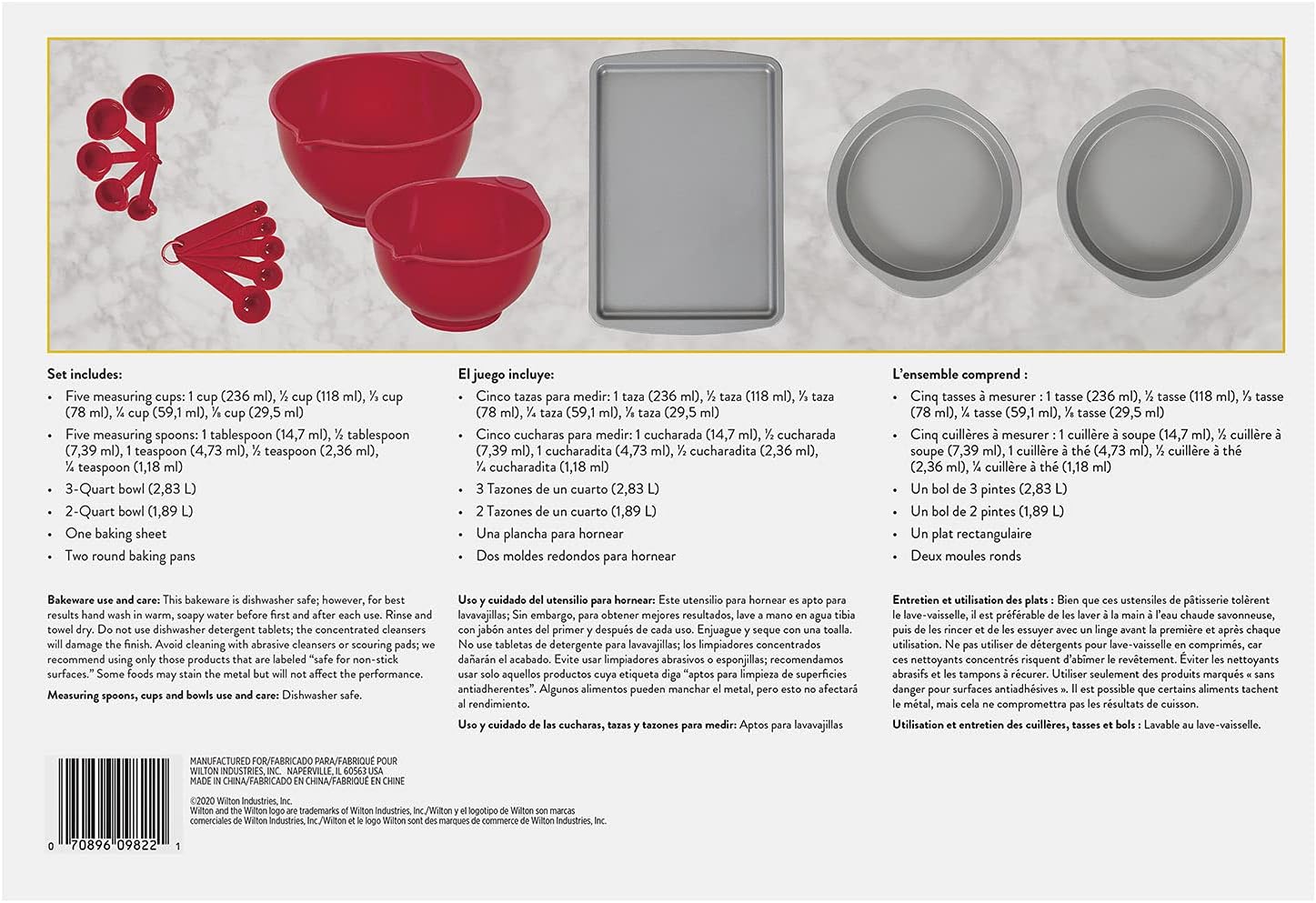Brand new, Wilton 15-Piece Baking Set, 2106-0-0147. Set includes: Five plastic measuring cups (1c, 1/2c, 1/3c, 1/4c, 1/8c), five plastic measuring spoons (1T, 1/2T, 1t, 1/2t, 1/4t), two plastic bowls (3 qt and 2 qt), one 9" x 13" non-stick baking sheet, and two 9" non-stick round baking pans. Plastic-ware is dishwasher safe. For best results hand wash and dry non-stick pans. Buy it for yourself or get one for your favorite baker, this set is perfect for gifting!