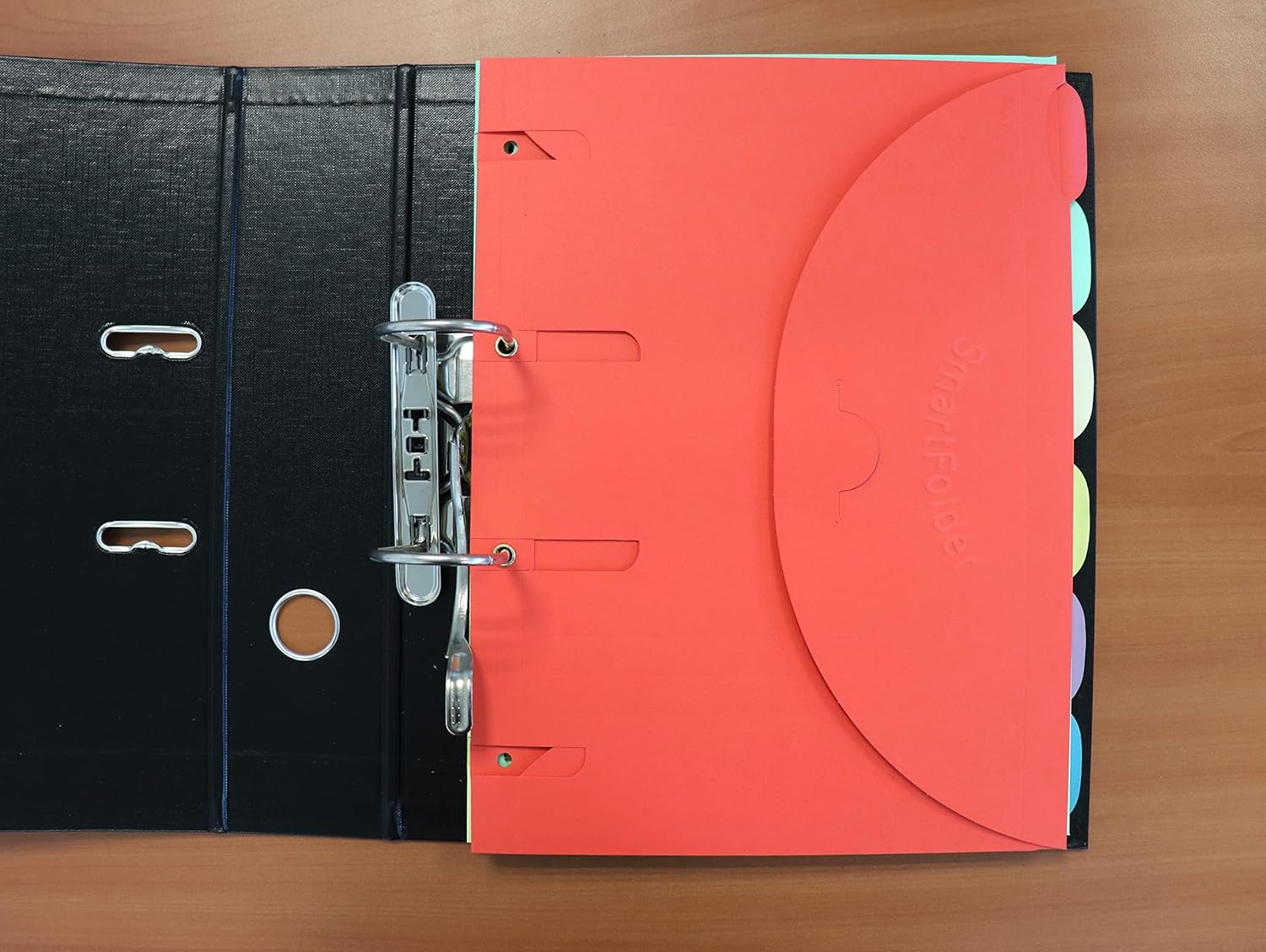 Pack of 100 file folders, 6 different colours with integrated divider, filing of the folders without perforation, Velcro closure, resistance to the eyelets, capacity 1 to 100 pages, the Smartfolder is a saving of time and ease of use.