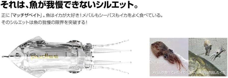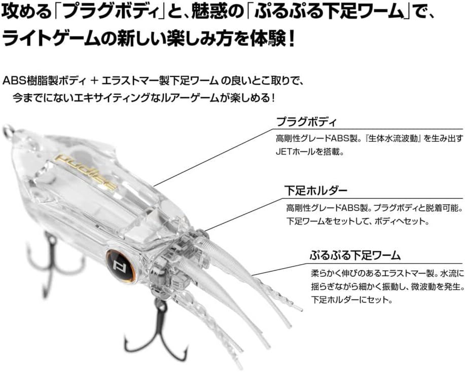 Squid Shaped Lure for Light Games, Squid Regular Size Combines ABS plug body with JET hole that emits "bio-flow waves" (backward water) just like our Tylaba JET, and an elastomeric lower foot worm that emits a glossy subtle wave. Target fish: Sea Bass, Meal and Mackerel *Can be used with both shore and offshore fish. Show off your charming stay! Simply wind it up and pull out the intense bites of water explosion. The plug and lower leg worms are good enough to enjoy thrilling bites under the water. The rectifier keel effect on the top of the body and within the JET hole, keeping your swim upright and stable without compromising your posture even when you wind it up or swing. "The best feature is "just fun!" This is an innovative lure that changes the way you enjoy light games.