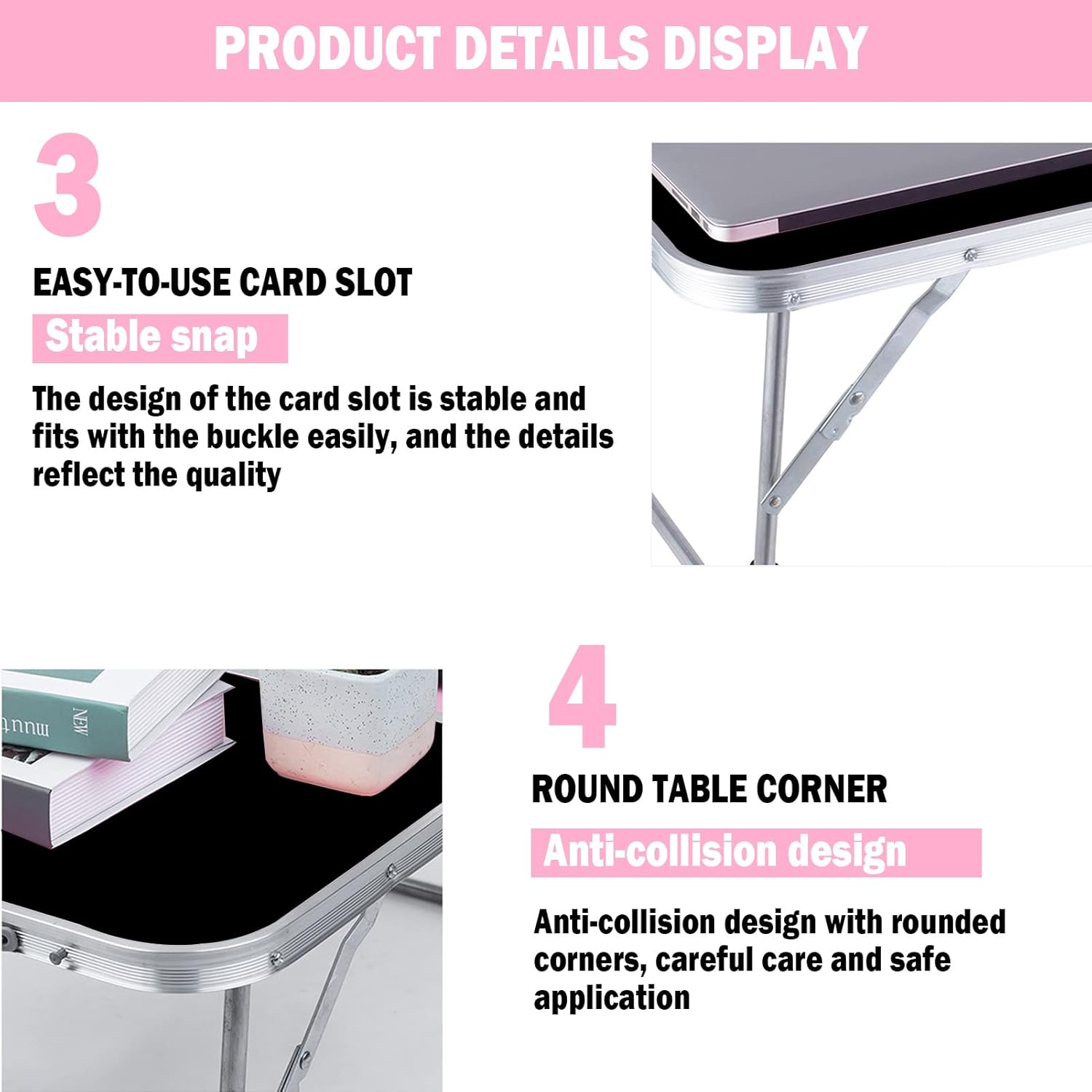 Portable folding table is perfect for your home! It is not only a table, but also a good partner for your camping, studying, working, dining and entertainment. On weekend mornings, you can use it to enjoy a delicious breakfast in bed; on weekday evenings, it is your right-hand man when you work overtime; in your spare time, it can be your best companion for catching up on TV shows and playing games. On casual weekends, it is a good partner for you and your friends to have a picnic!