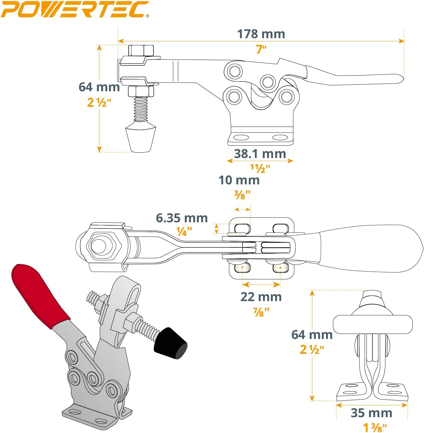 Introducing the POWERTEC Quick Release Vertical Toggle Clamp, Horizontal Quick-Release Toggle Clamp, and 6" Toggle Clamp Foot—three essential tools designed for precision, strength, and versatility in woodworking projects. The Vertical Toggle Clamp is perfect for jig assembly, tool fixtures, and movable bases. Featuring a vertical front-mount push toggle design, it offers an adjustable, secure hold with a 200 lbs capacity. Ideal for projects requiring specific clamping for drilling, welding, or milling, this clamp provides maximum clearance and easy operation with its high-grade steel construction and vinyl grip handle. Its quick-release mechanism ensures fast adjustments, and the zinc-plated coating improves durability and corrosion resistance. The Horizontal Quick-Release Toggle Clamp is a compact, powerful tool that delivers a rock-solid grip on your workpieces. Its low-height design allows for maximum clearance, while the retractable clamp permits vertical removal of clamped items. With a vinyl grip for comfort and easy identification, this clamp features corrosion-resistant zinc plating, making it an ideal solution for precise clamping in tight spaces. The 6" Toggle Clamp Foot extends your clamping reach, providing stability and precision. It features a swivel-action foot that adapts to angled surfaces and offers adjustable pressure to prevent damage while maintaining a secure hold. Constructed from durable nylon with a non-slip rubber base, this foot integrates seamlessly with various toggle clamps and can be mounted to T-track for added flexibility. It’s designed for demanding projects, ensuring your workpieces stay perfectly aligned. Together, these tools offer unmatched flexibility, control, and durability, making them indispensable for professionals and DIY enthusiasts alike.