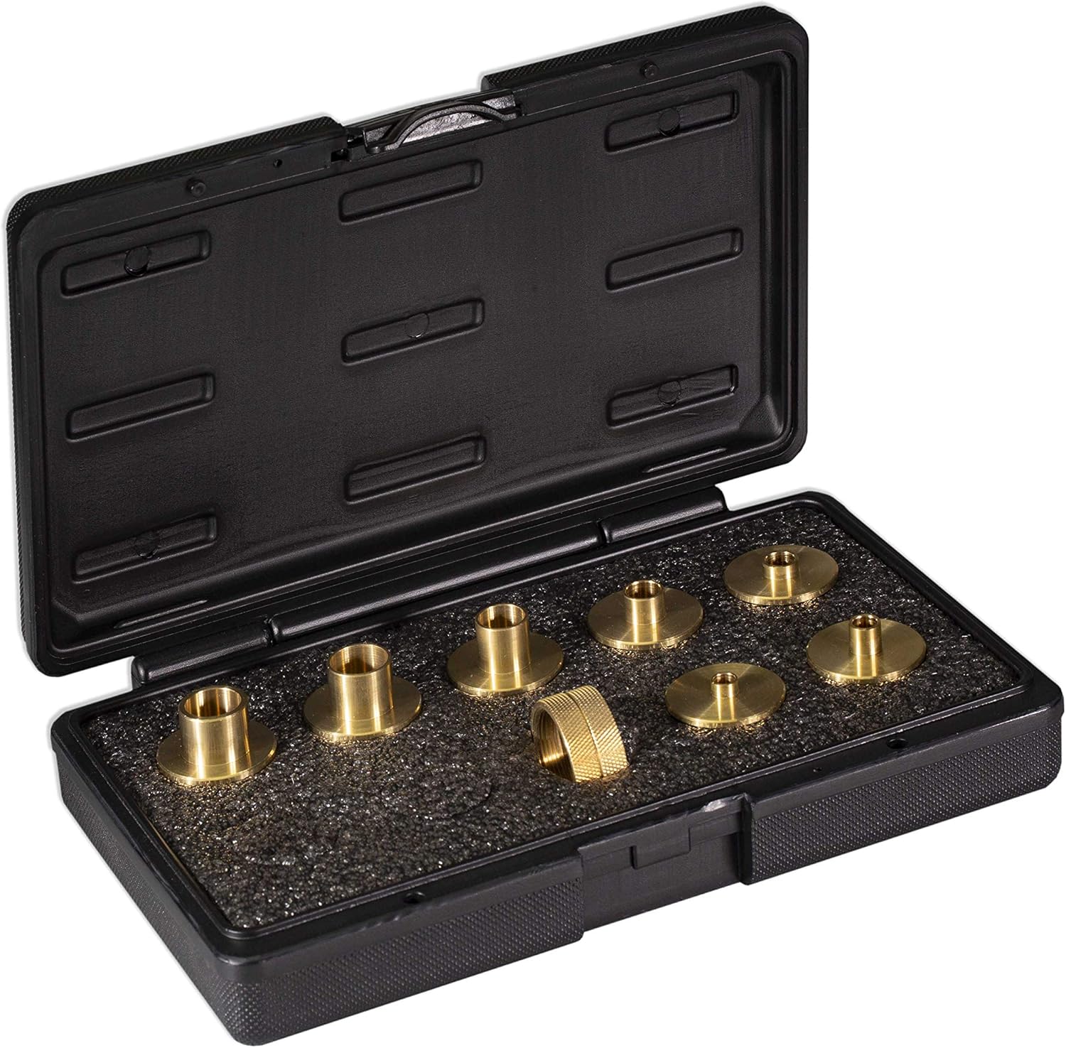 | Included Components | INCLUDES: 10-Piece Router Template Guide Bushing Set with (8) guide bushings, (2) lock nuts and a carrying case, (1) Centering pin with 1/4” & 1/2" ends | (1) Cone |