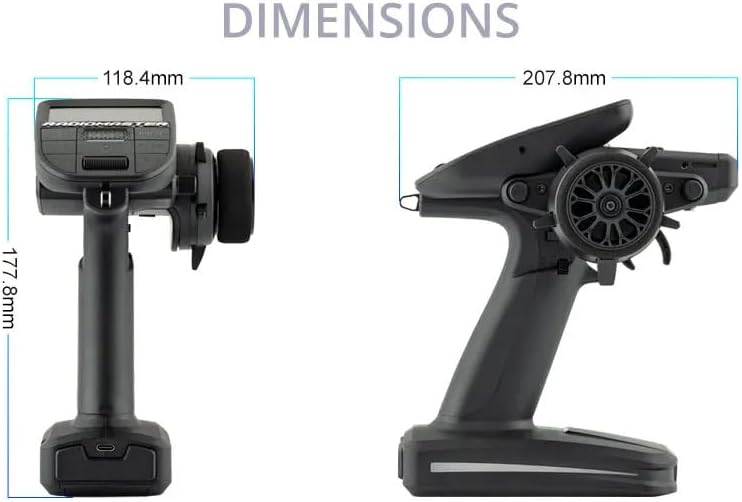 Specification MT12Item: MT12 Surface RadioPhysical dimensions: 177.8*118.4*207.8mmWeight: 480 gramsOperating frequency: 2.400GHz-2.480GHzInternal RF Options: ELRS 2.4GHzOperational current: 320mA for ELRSOperational voltage: DC 6.6-8.4VOperating system: EdgeTXControl channels: 16 as standardDisplay: 128*64 Monochrome LCDBattery: 2 x 18650 cells or a 2s 7.4v 5000mah battery pack (Batteries not included)Charging: Built in USB-C ChargingFirmware Upgrade method: Via USB or SD cardWheel and Trigger sensor: Hall-effectModule bay: Nano size Specification ER3C-i (Included with ExpressLRS version)Item: ER3C-i 2.4GHz ELRS PWM ReceiverPower supply: DC 4.5 - 8.4VAntenna type: Built-in high-sensitivity ceramic antennaWireless protocol: ExpressLRS 3.3.0 pre-installedOutput channel: 3CH PWMTelemetry power: 10mWBattery voltage detection range: DC 4.0 - 35VWeight: 4.2 gramsDimensions: 26.1*18.5*13.0 mmFirmware: Device Category: Radiomaster 2.4Ghz / Devic