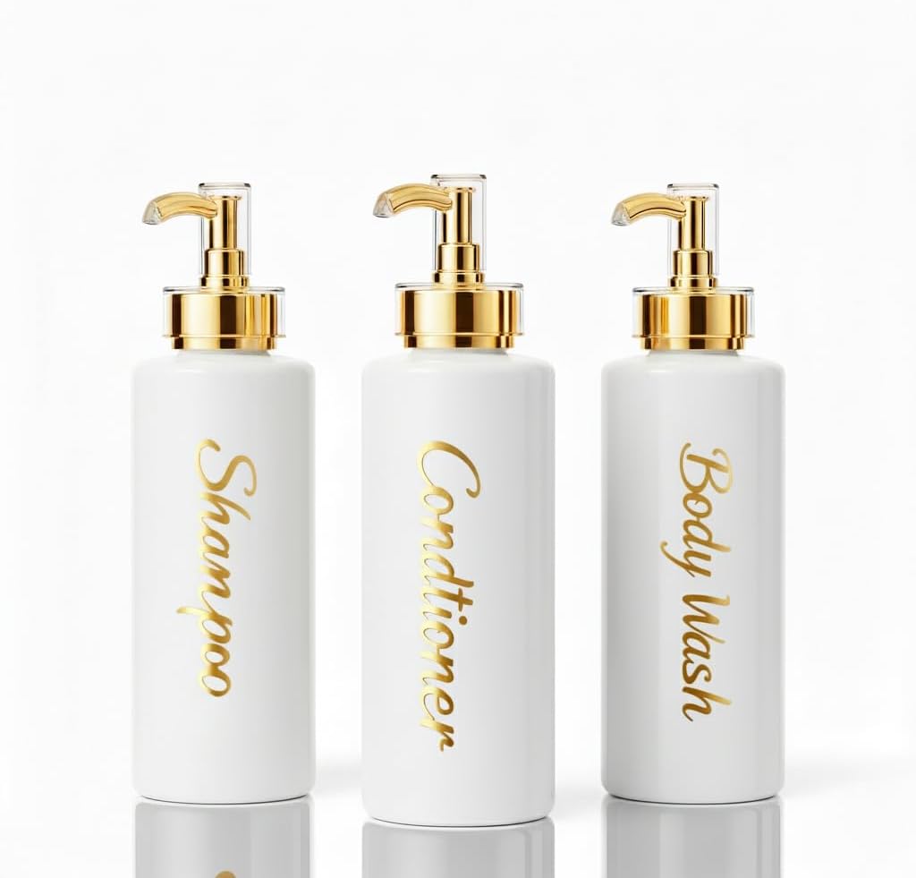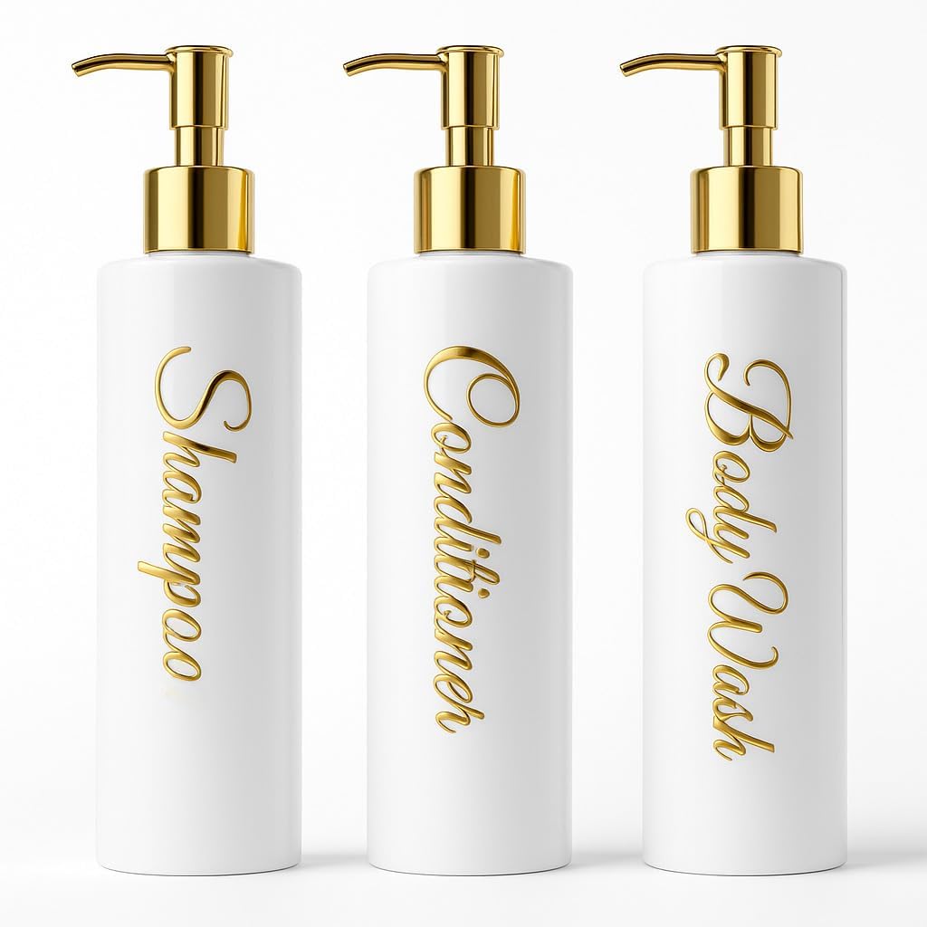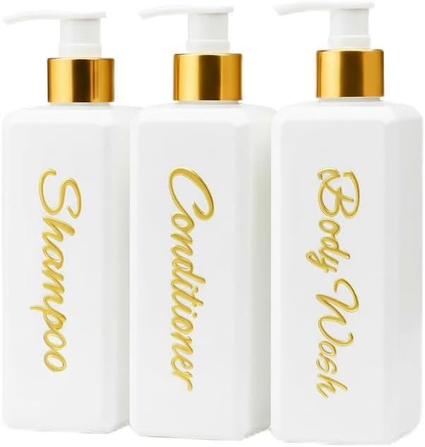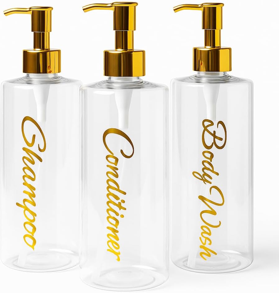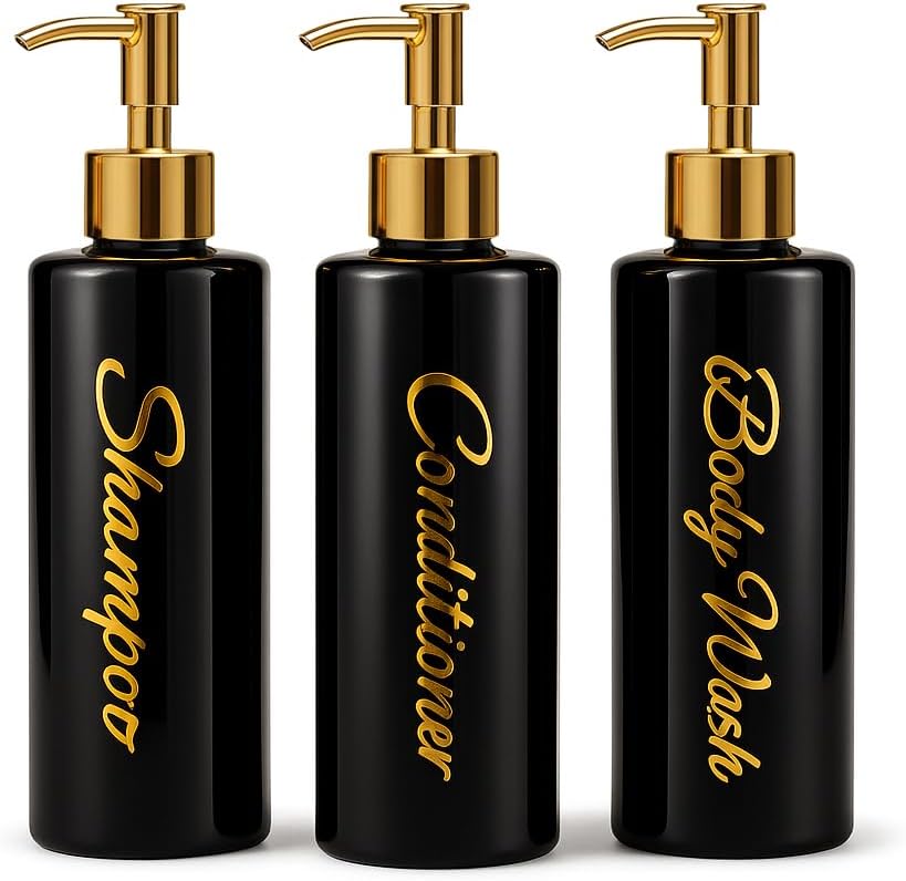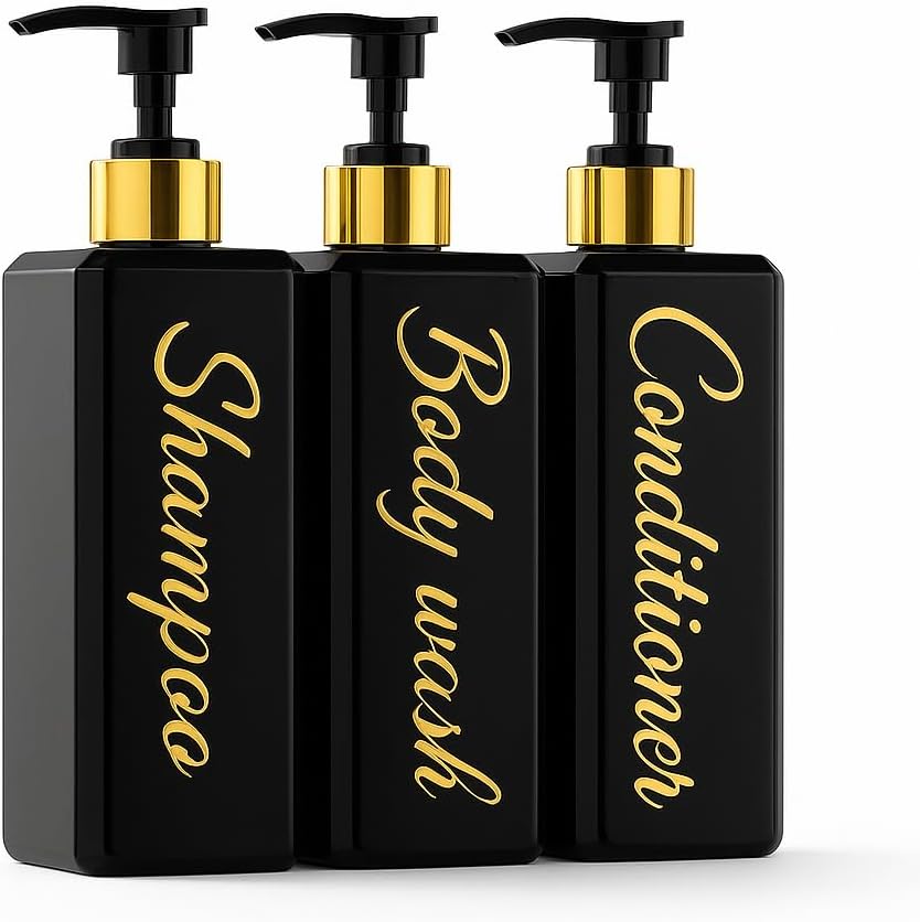| Included Components | 3 x Bamboo/Gold Cap (check variations), 3 × 500ml dispensers (Shampoo, Conditioner, Body Wash) in stylish script labelling, Bottles |