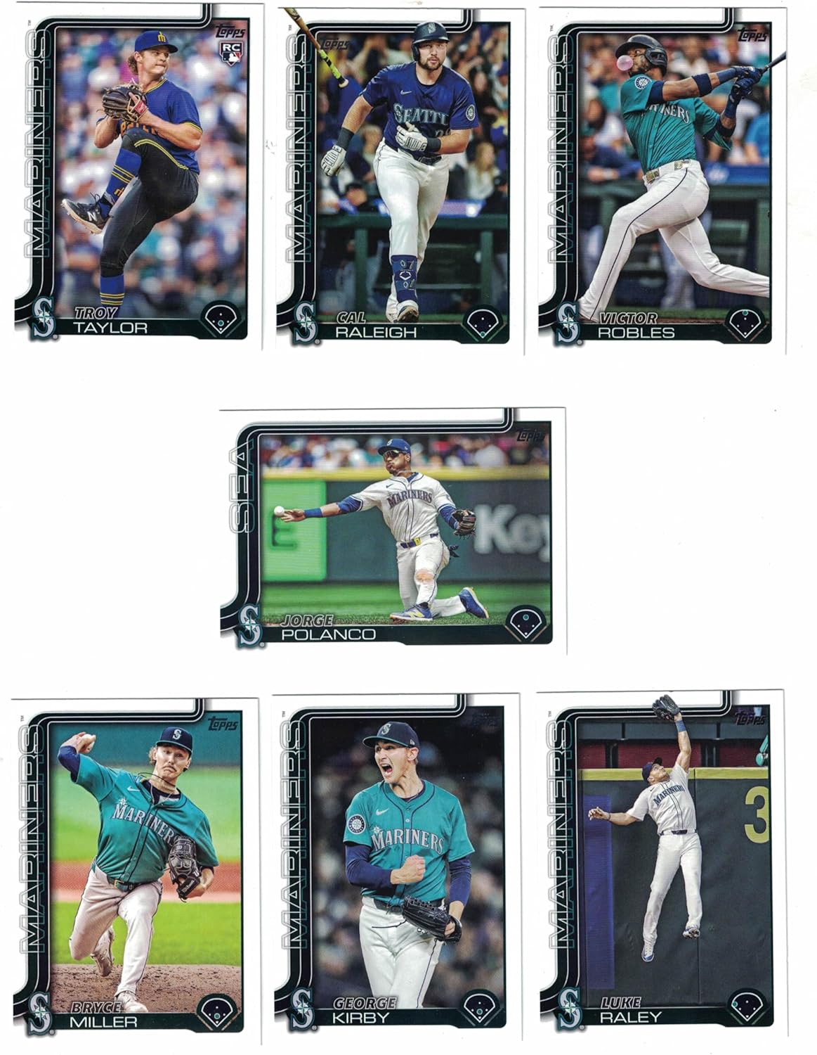 This is the 2025 Topps (Series 1 and 2) Seattle Mariners Baseball Card Team Set. There are (19) cards included in this team set. Players included are: Mitch Haniger(#15), Logan Gilbert(#66), Luis Castillo(#73), Seattle Mariners(#96), Dylan Moore(#105), Randy Arozarena(#111), Tyler Locklear(#192), Ryan Bliss(#251), Julio Rodriguez(#266), J.P. Crawford(#298), Bryan Woo(#327), Mitch Garver(#338), Bryce Miller(#358), Jorge Polanco(#361), George Kirby(#468), Luke Raley(#534), Victor Robles(#572), Cal Raleigh(#603), Troy Taylor(#691)