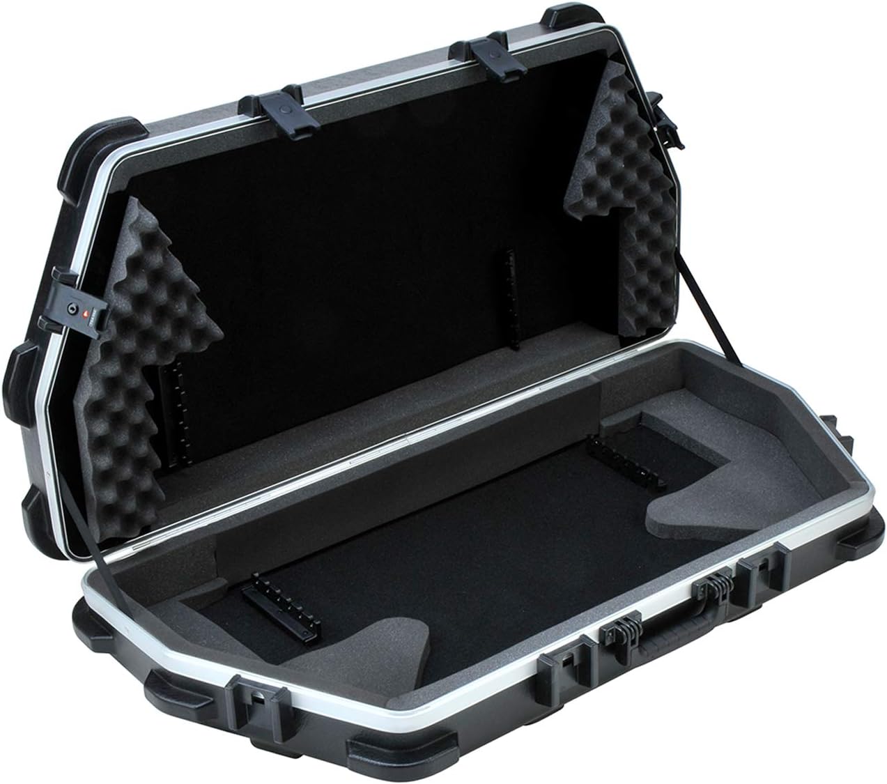 The SKB ATA Parallel Limb Double Bow Case features heavy duty field replaceable locking latches, spring-loaded end handle for comfortable towing and protection from damage, molded in bumper protection to maximize impact resistance and quiet glide heavy duty wheels for easy transport, secure "tie-down" loops for ATV transport are an added feature and stylish embossing that actually adds structural support to the lid. 41" x 15.5" x 6".